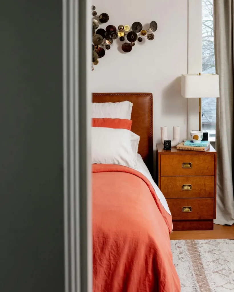 It’s warm, grounded, and looks like the perfect place to curl up with a good book and a mug of chai. The branches in vases on either side of the bed echo the dark tones in the room, tying everything together in a way that feels both intentional and effortless.