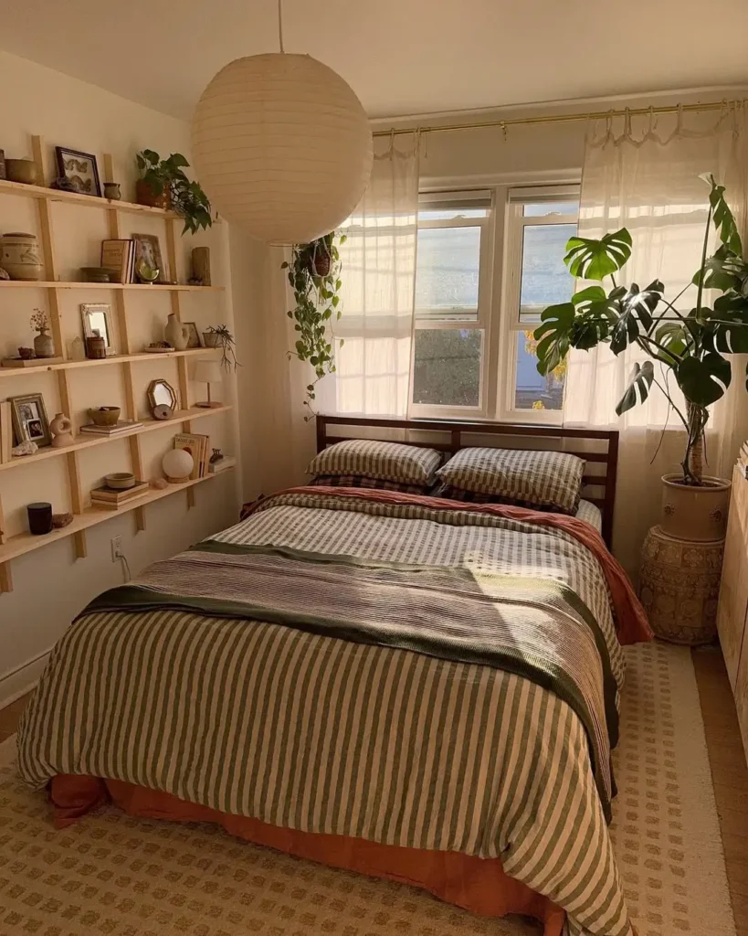 It’s warm, grounded, and looks like the perfect place to curl up with a good book and a mug of chai. The branches in vases on either side of the bed echo the dark tones in the room, tying everything together in a way that feels both intentional and effortless.