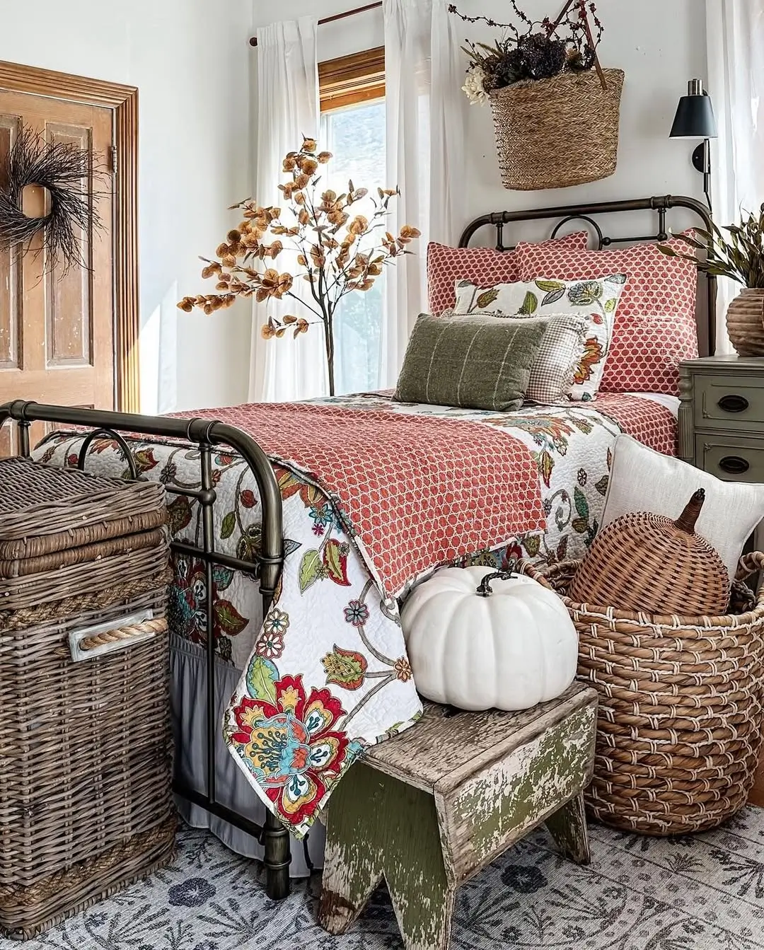 Rusty throw blankets, mixed plaid pillows, and a sweet little pumpkin wreath perched above the headboard make it all come together. I love how simple it is and how much character it brings. Pro tip: Don’t be afraid to mix plaid patterns.