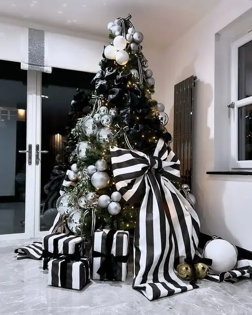 The black-and-white striped gifts underneath complete the whole look perfectly. It’s giving modern glam meets holiday cheer. If you’re recreating this, play with different ribbon textures like satin, velvet, or sheer to give your tree dimension.
