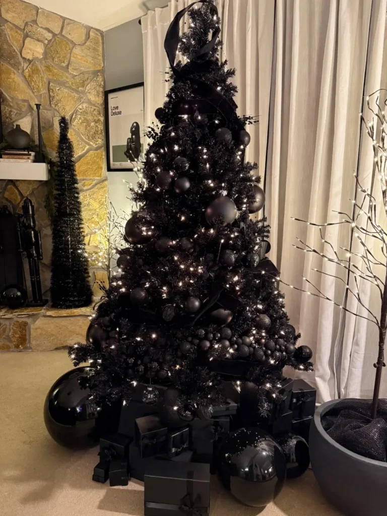 Okay, for the brave hearts, this one’s for you. A black Christmas tree, black ornaments, black lights, even black presents tucked underneath. It sounds intense, but it’s absolutely stunning when done right. The key is to layer textures.