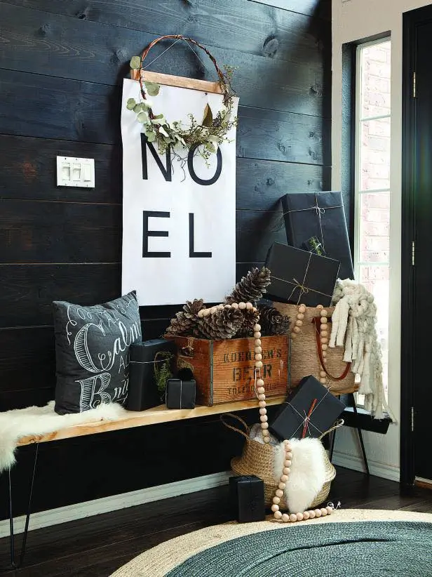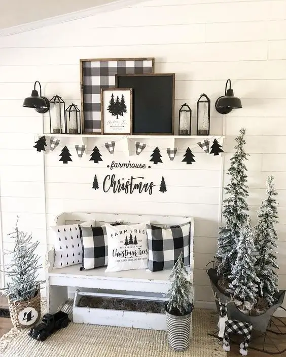 Nothing beats the timeless combo of black and white. A rustic white entry bench dressed with black-and-white Christmas-themed pillows instantly feels cozy and clean. Add a couple of black lanterns, a farmhouse sign, and a natural Christmas tree adorned with black ornaments.