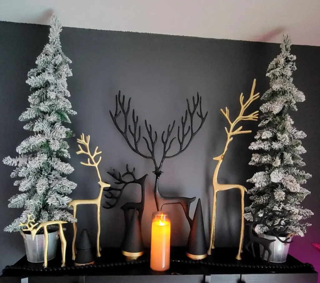 If you’ve got a black accent wall, lean into it. A black mantle decorated with 2-3 foot frosted trees creates that beautiful contrast of light and dark. Mix gold and black reindeer decor pieces and some tabletop Christmas trees with gold bases for sparkle.