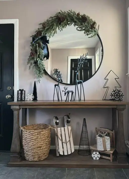 Above it all, hang a black-framed round mirror wrapped with a garland and tied with a black bow. It’s rustic, simple, and modern in the best way. This is the perfect setup if you love the festive vibe but don’t want your space to feel cluttered.