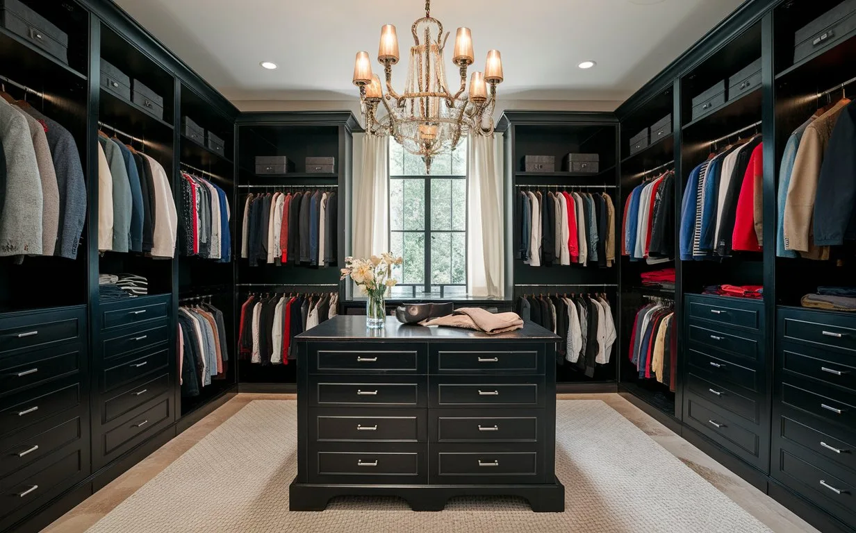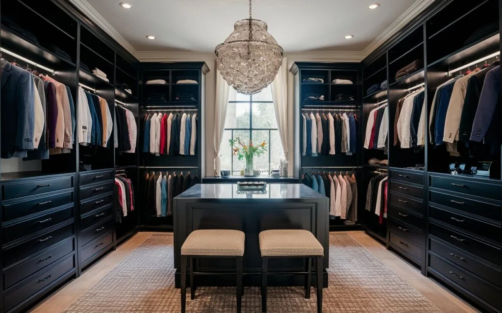 When designing a black closet, it’s essential to balance the dark color scheme with lighter elements to avoid a cave-like feel. Here are some design tips to keep in mind: