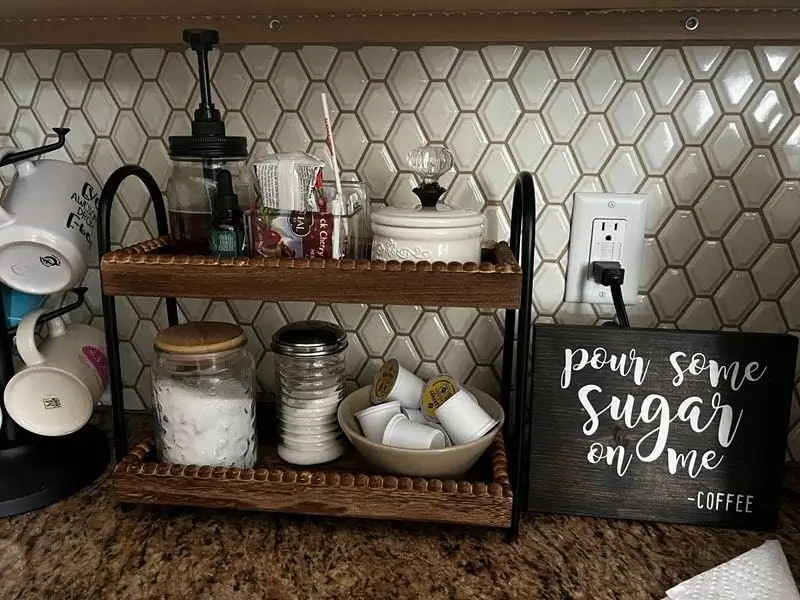 Glass jars instantly make everything look more polished and organized. Sugar, coffee beans, pods, and sweeteners all look better when they are visible and neatly stored.
