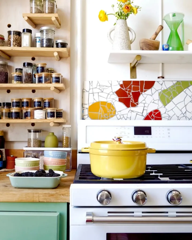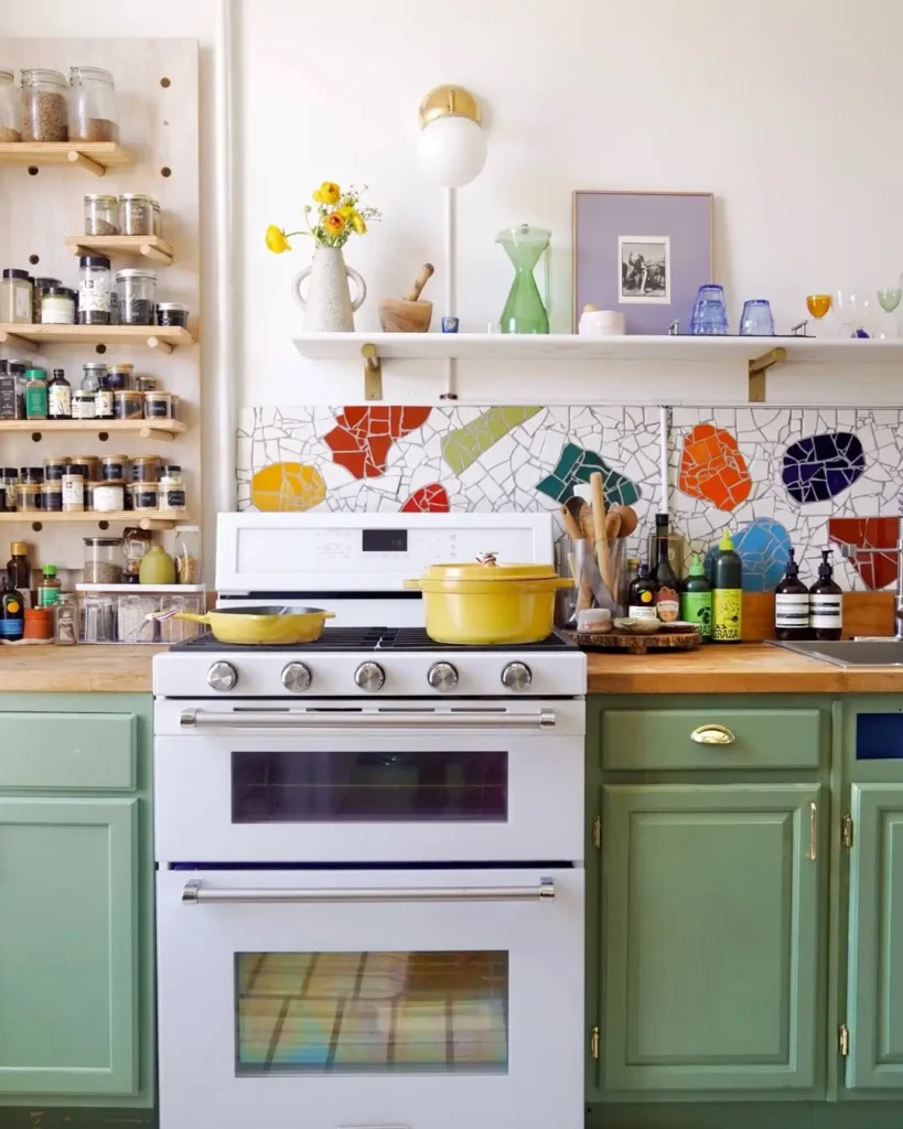 @dearsaturday created a true art moment with this broken-tile mosaic backsplash. White tiles with scattered colorful pieces give the kitchen a handmade, organic feel. Paired with green cabinetry, the look becomes soft, earthy, and full of charm.