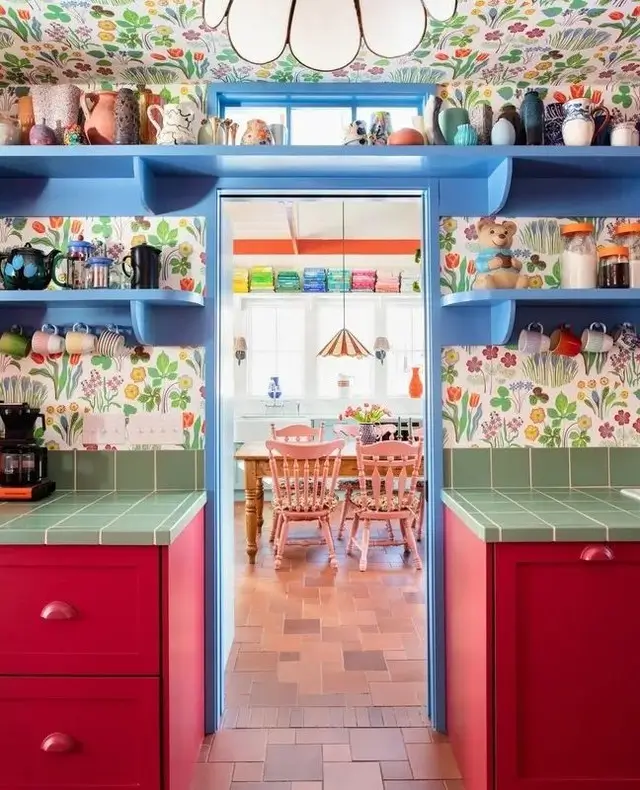 Designed by @studionickspain for @grossypelosi, this kitchen blends 4×4 green counter tiles with mixed floral wallpaper. The red cabinets and blue shelves make the whole room feel like a cozy cottage you never want to leave. It’s bold but still warm.