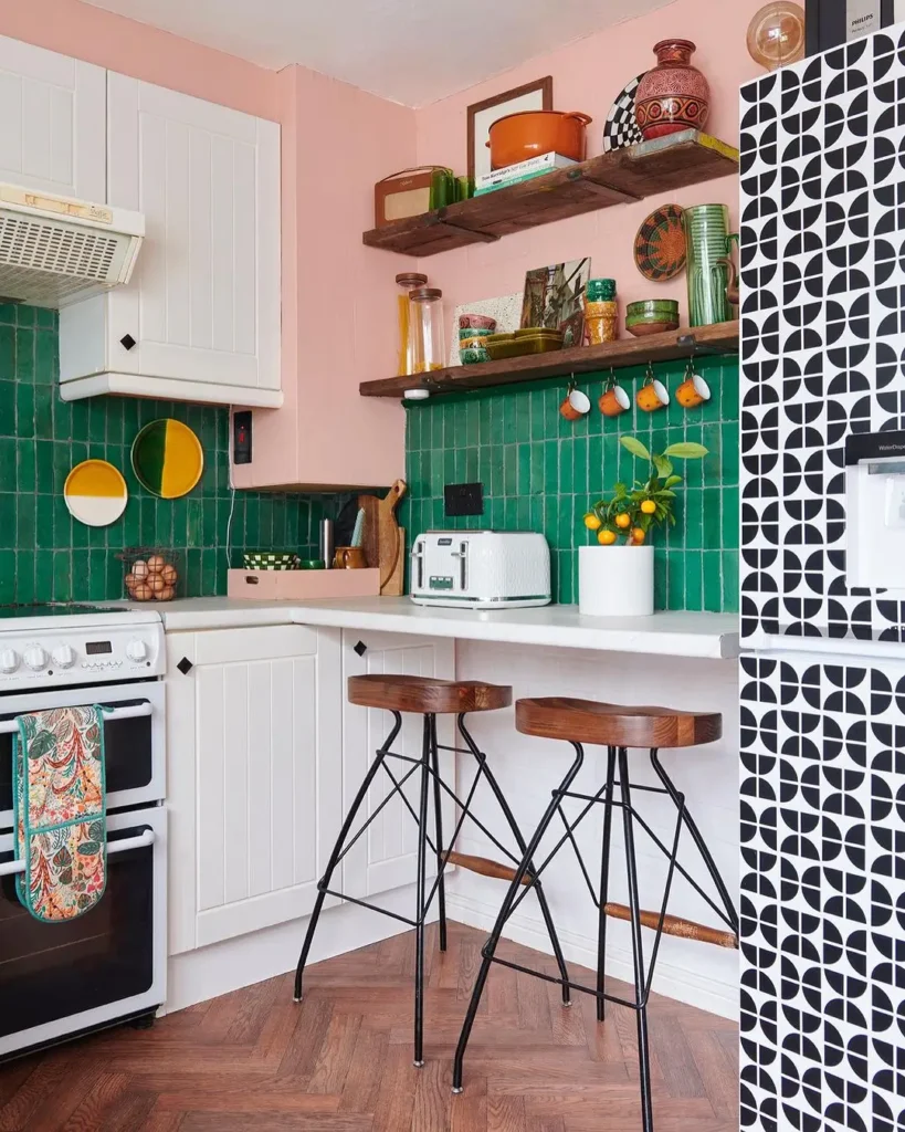 Image by @iamhayleystuart shows the sweetest cozy boho kitchen. Emerald zellige tiles paired with a pink wall create the kind of contrast that feels luxe without being loud.