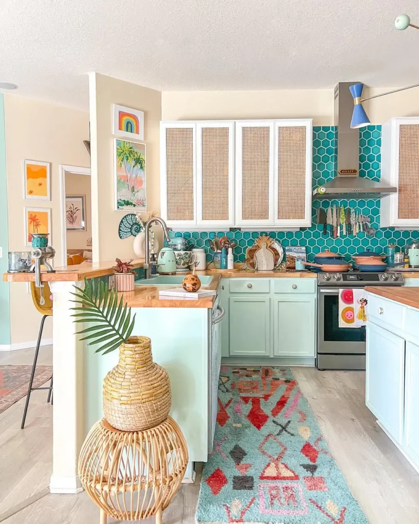 This one stopped me in my tracks. Shared by tiny.kitchenette and designed by @paintthetownpastel, the pastel cyan-lime cabinets with the matching backsplash feel like something straight out of a fairy kitchen.
