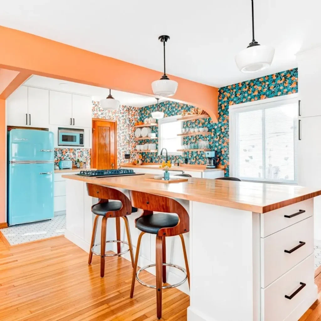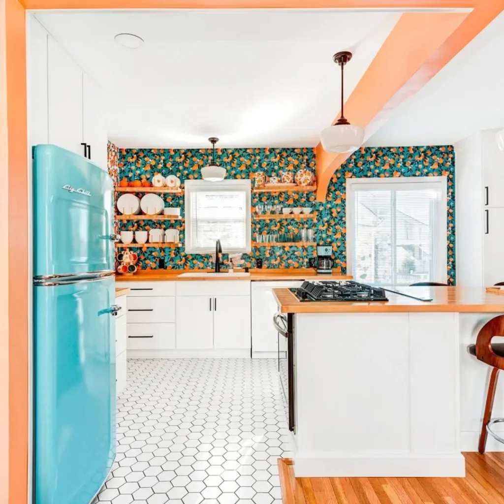 The tropical feel in this kitchen shared by bigchillappliances and designed by irvingtonretro is something I instantly fell in love with. White cabinets, a turquoise retro fridge, and an orange tropical print wallpaper make the space bright and cheerful.