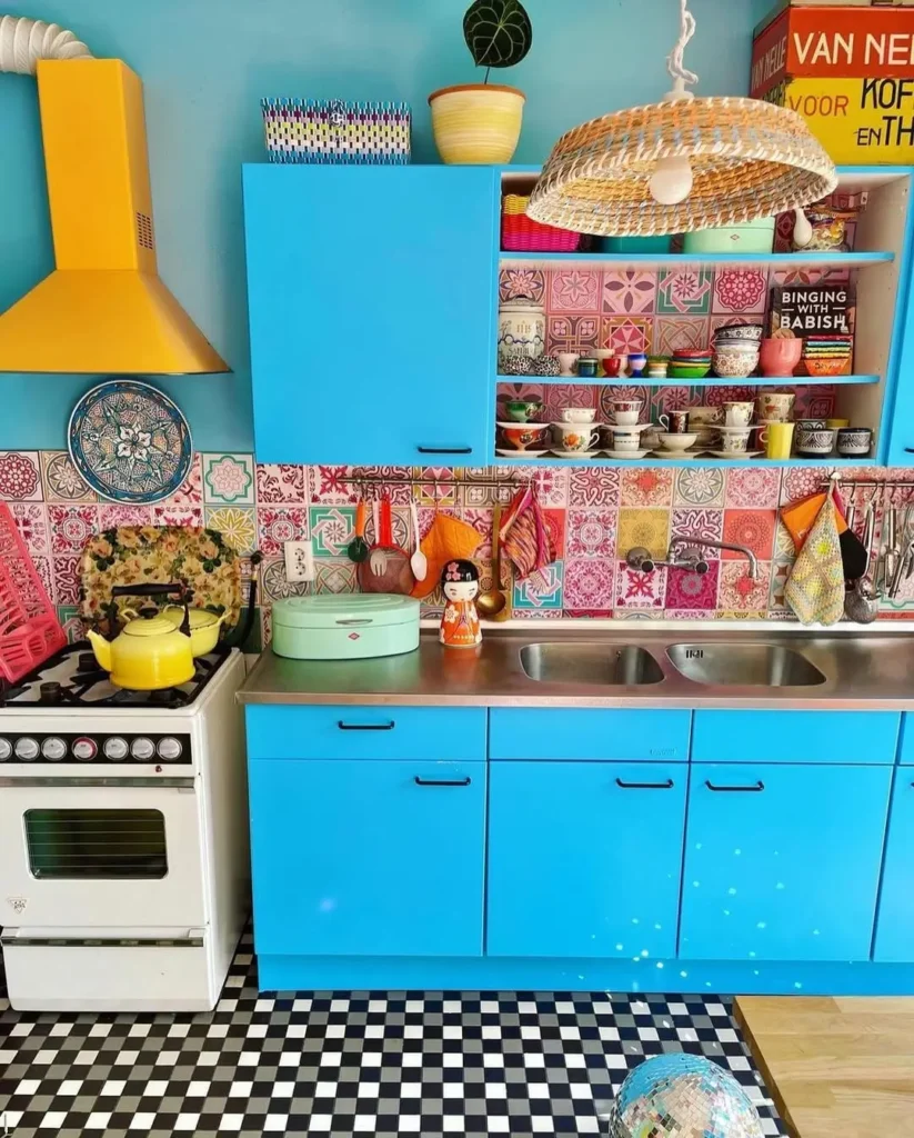 @colorful_kimmes knows how to mix patterns like a pro. Pink toned printed tiles give off Moroccan vibes, especially against the yellow hood and bold cyan cabinetry. The accent appliances and pottery take the whole look over the top in the best way. This is dopamine decor at its most confident.