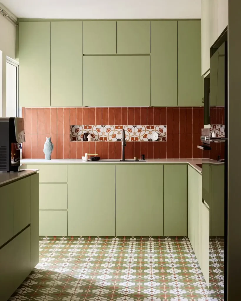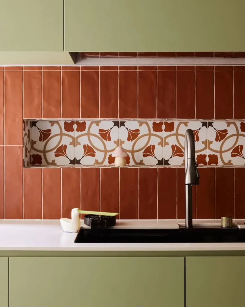 donebynadia_ designed a sleek and modern kitchen with a dark orange backsplash and a patterned tile cutout above the sink. Paired with sage cabinets, the whole space feels warm, earthy, and grounded. Orange and sage always play well together.