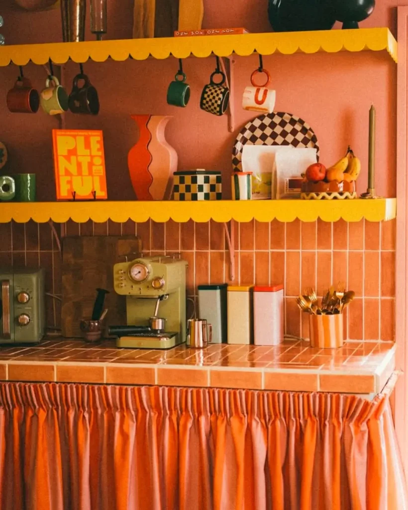 Shared by interiorsocialclub and designed by @groovyhousestudio, this kitchen is pure sunshine. The orange 2×6 tile is cozy and bright, and the pink walls behind the shelves give the room a soft glow.