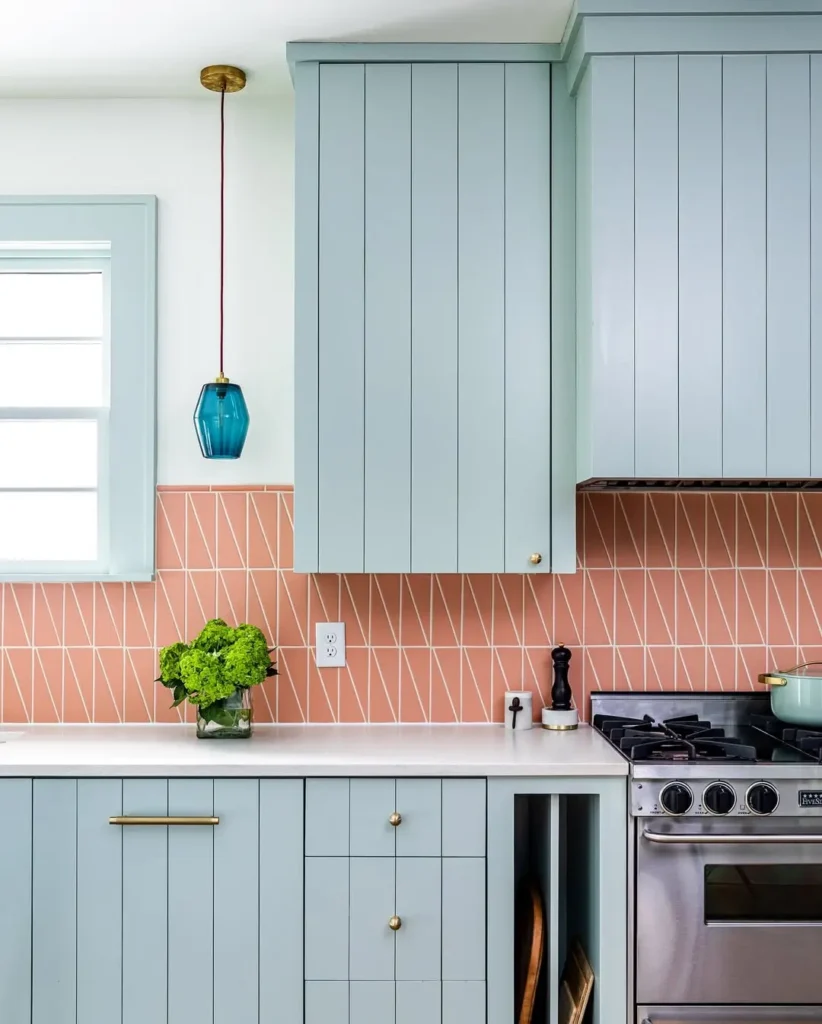 Laurajenkinsinteriors created a kitchen that feels smooth, warm, and effortlessly modern. The peach backsplash pairs beautifully with pastel cyan cabinetry. Blue cabinets in the wider kitchen space keep everything from feeling too sugary. It’s serene, balanced, and fresh.