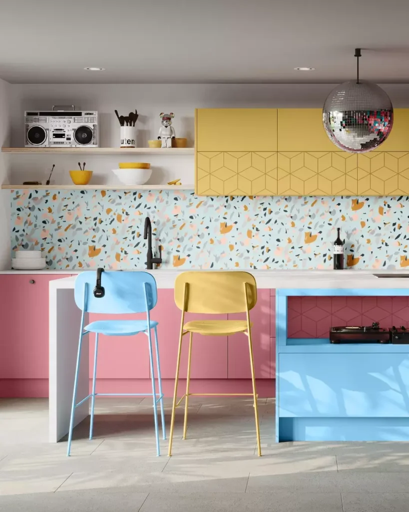 kitchenstudio.pe brings the party with pink and purple wallpaper, black and white terrazzo, and clear acrylic stools. Add in disco lighting and the whole space becomes playful and modern. It’s perfect if you want a colorful backsplash moment without committing to tile.