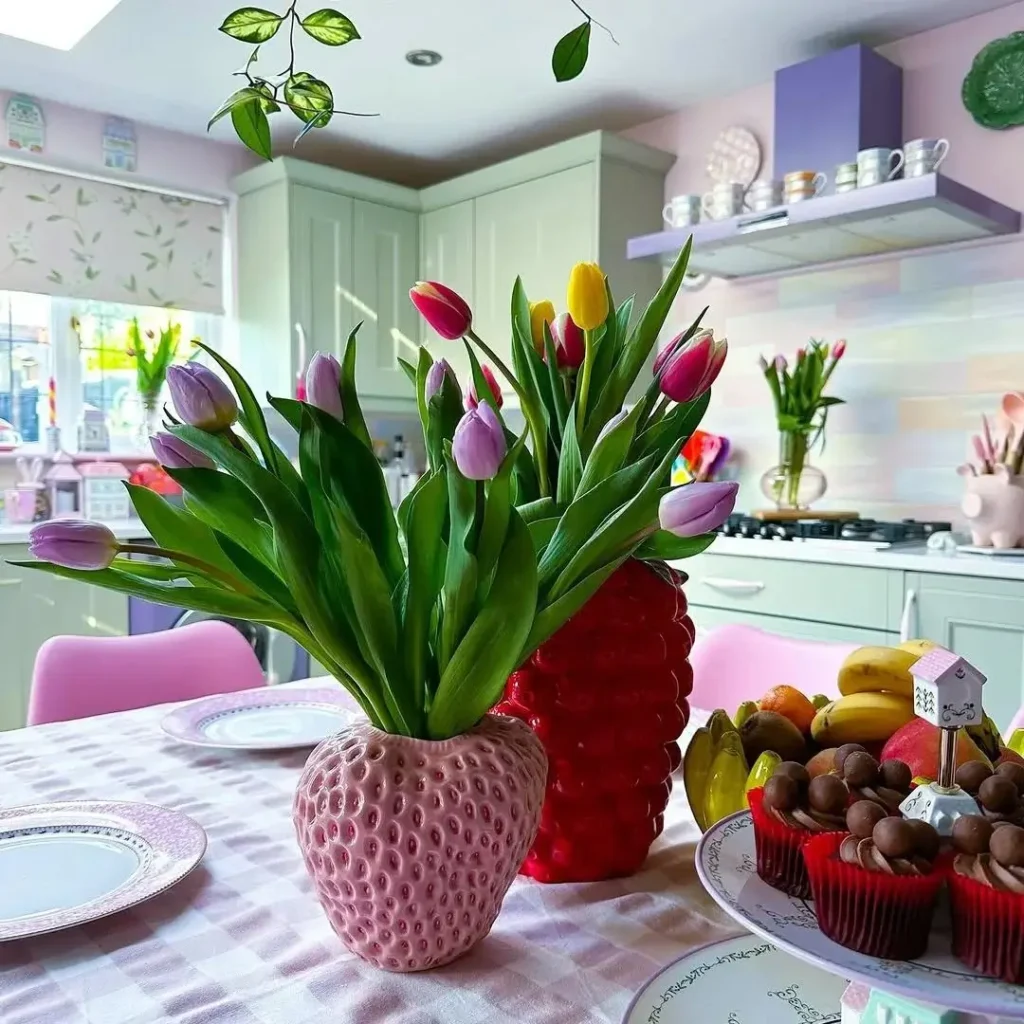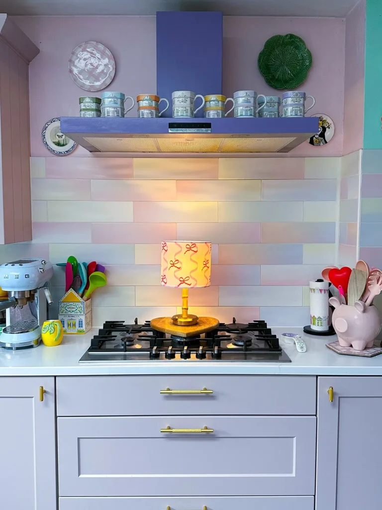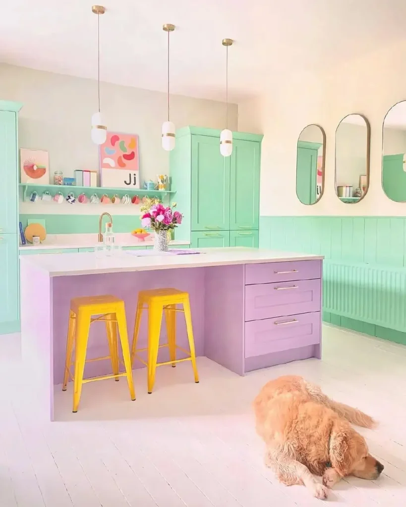Add a pastel purple island, white countertops, and yellow stools and suddenly you’re inside a dopamine wonderland. It’s airy, charming, and unapologetically fun.