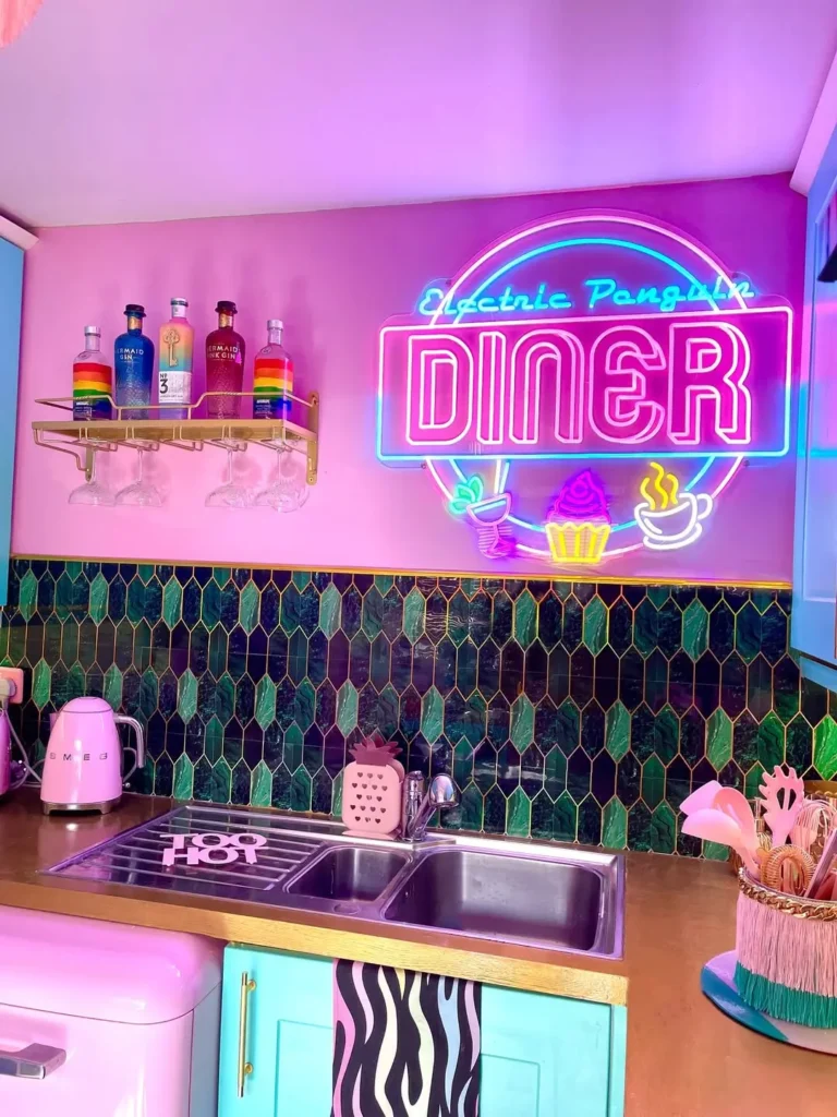 theeclecticpenguin always brings personality. The dark green picket tile backsplash with gold grout is dramatic and rich. Pink walls, light blue cabinets, and a retro pink fridge create the sweetest mix. It feels curated, fun, and full of charm.