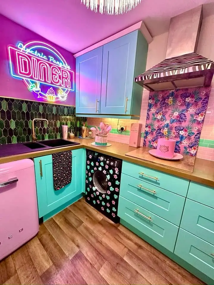Anyone who loves soft, dreamy tones needs to check out sorbet_dreams. This kitchen uses a beautiful pink and purple gradient wallpaper that looks like a sunset melting across the wall.