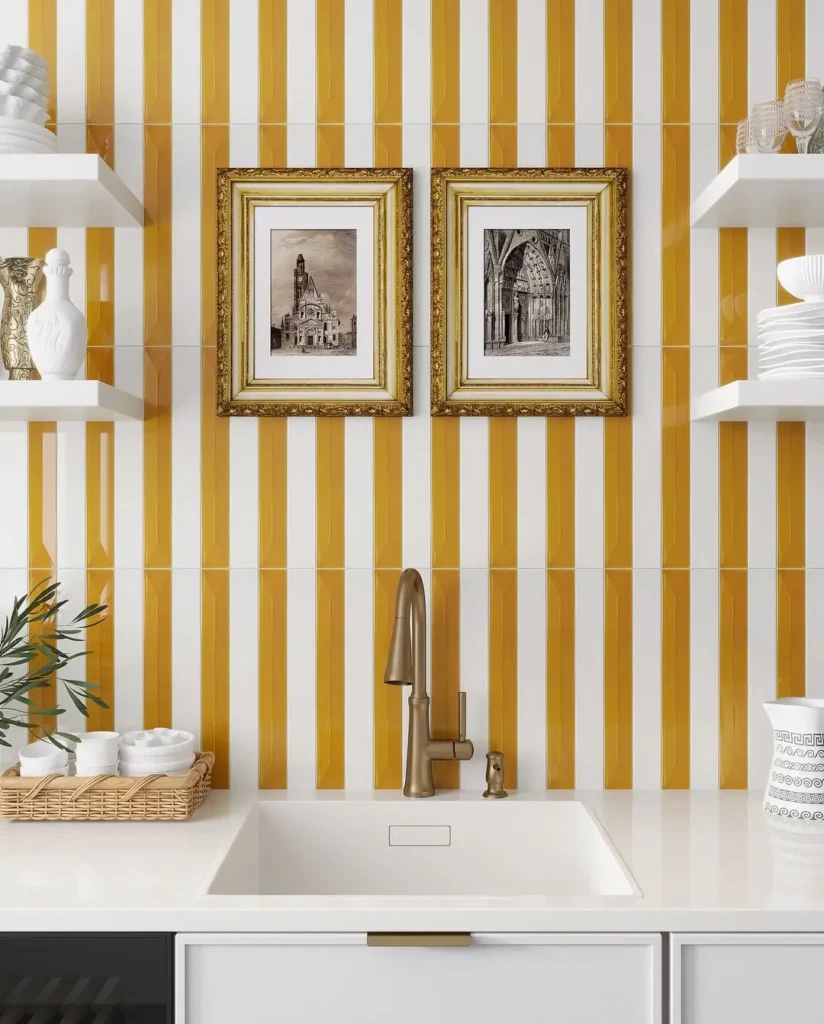 Mustard yellow and white vertical stripes might be my favorite of the whole list. It’s crisp, vibrant, and instantly uplifting. Against clean white cabinetry and black appliances, it feels modern but still full of personality. Simple, bold, and totally unforgettable.