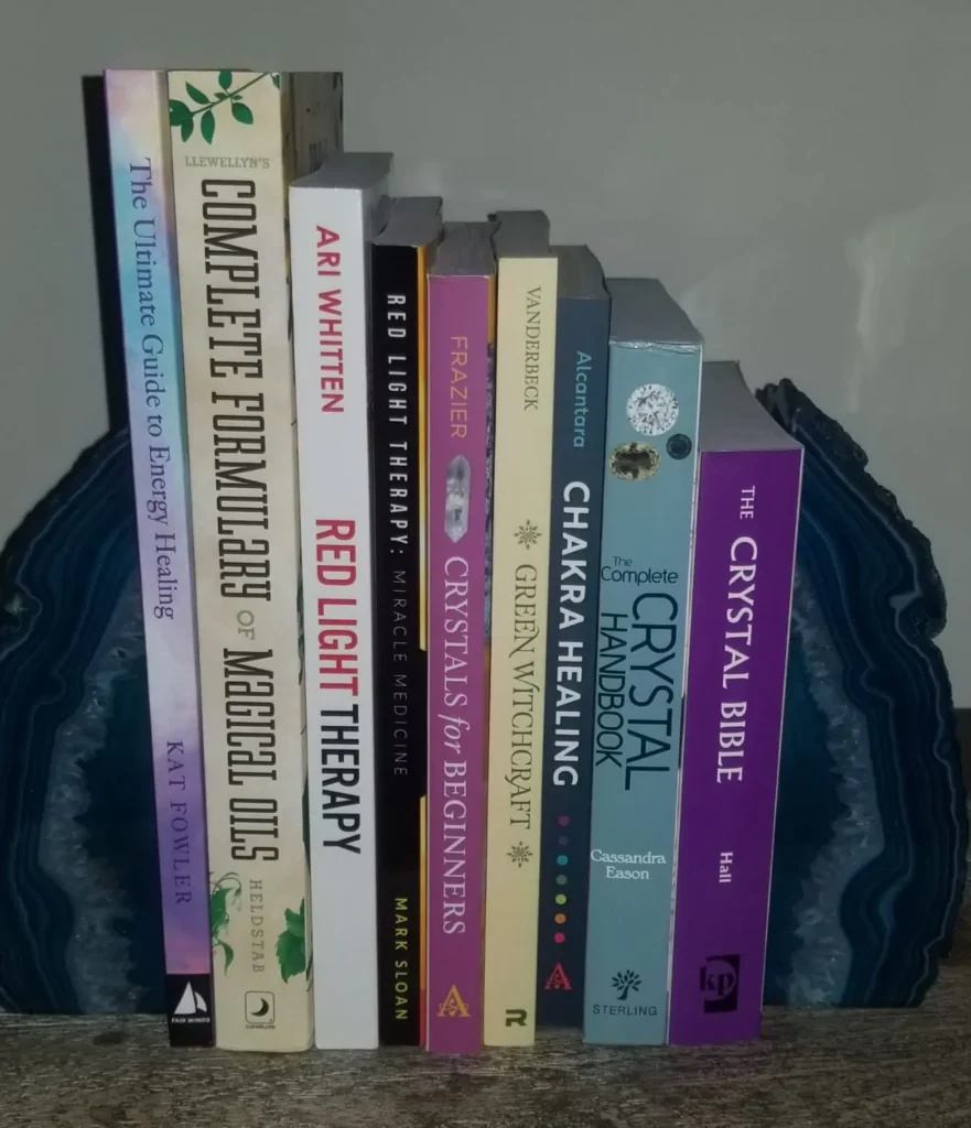Agate bookends come in teal, purple, or natural brown, and each polished piece is unique. They are perfect for lighter books and add natural texture.
