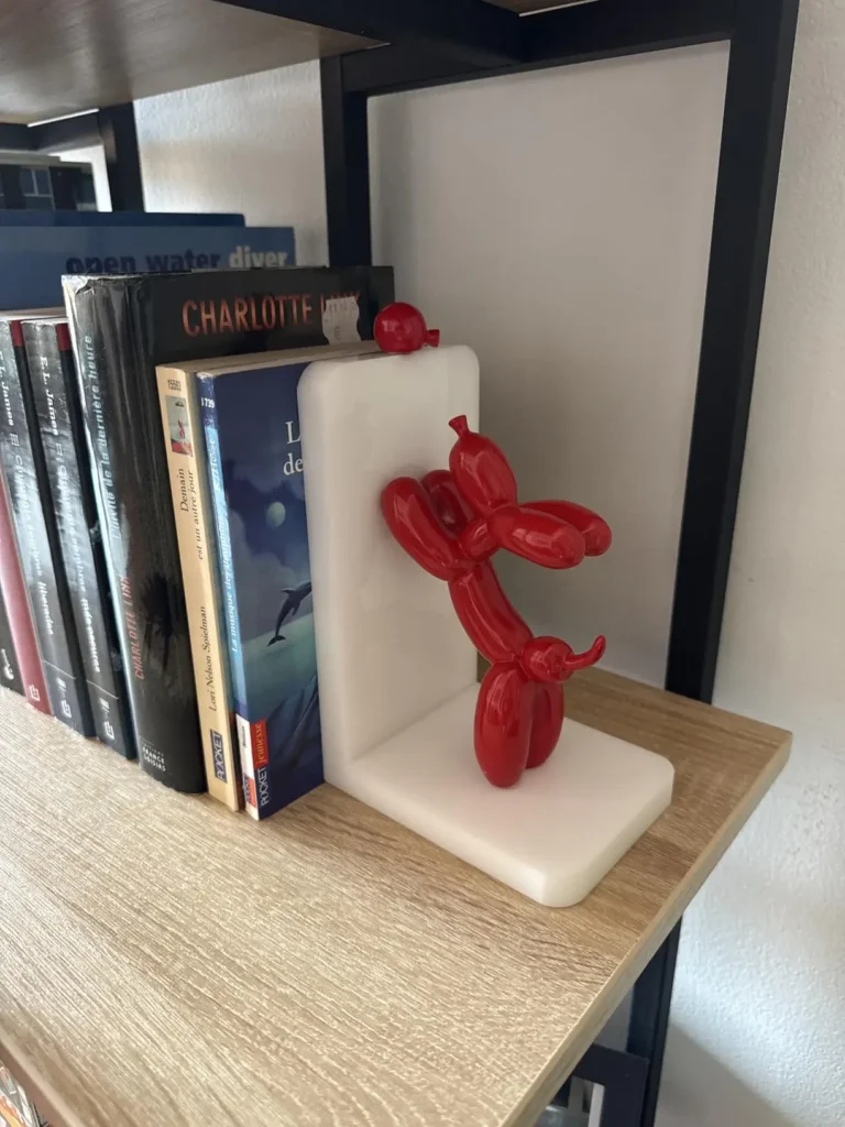 The red balloon dog bookends with a white base are playful and modern. Made from resin, they feel lighthearted but well made. They also make great gift ideas.