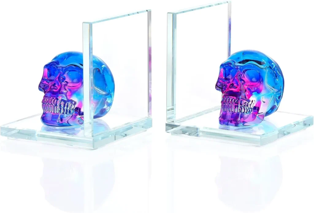 The purple blue crystal skull bookends are dramatic and stunning. Handmade from K9 crystal with a glass combo, they emit a subtle glow that feels moody and luxe. They are practical while still making a statement.