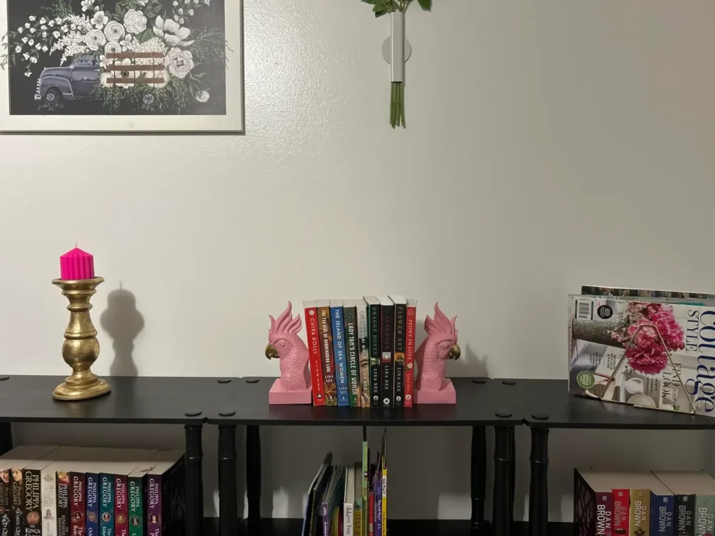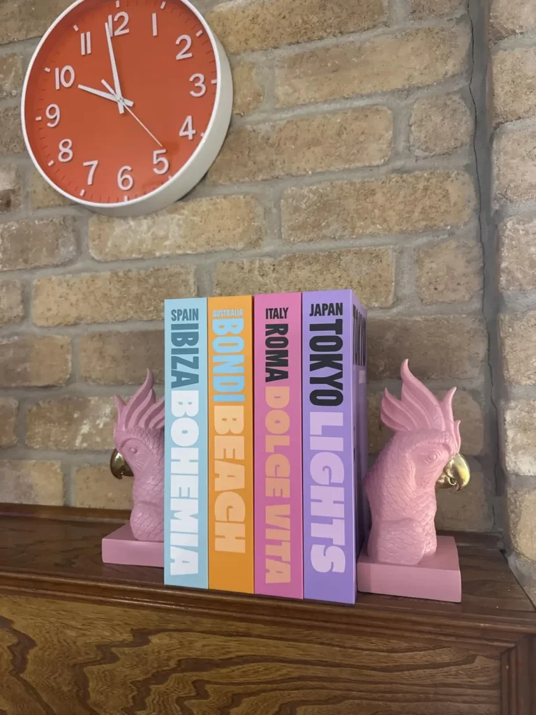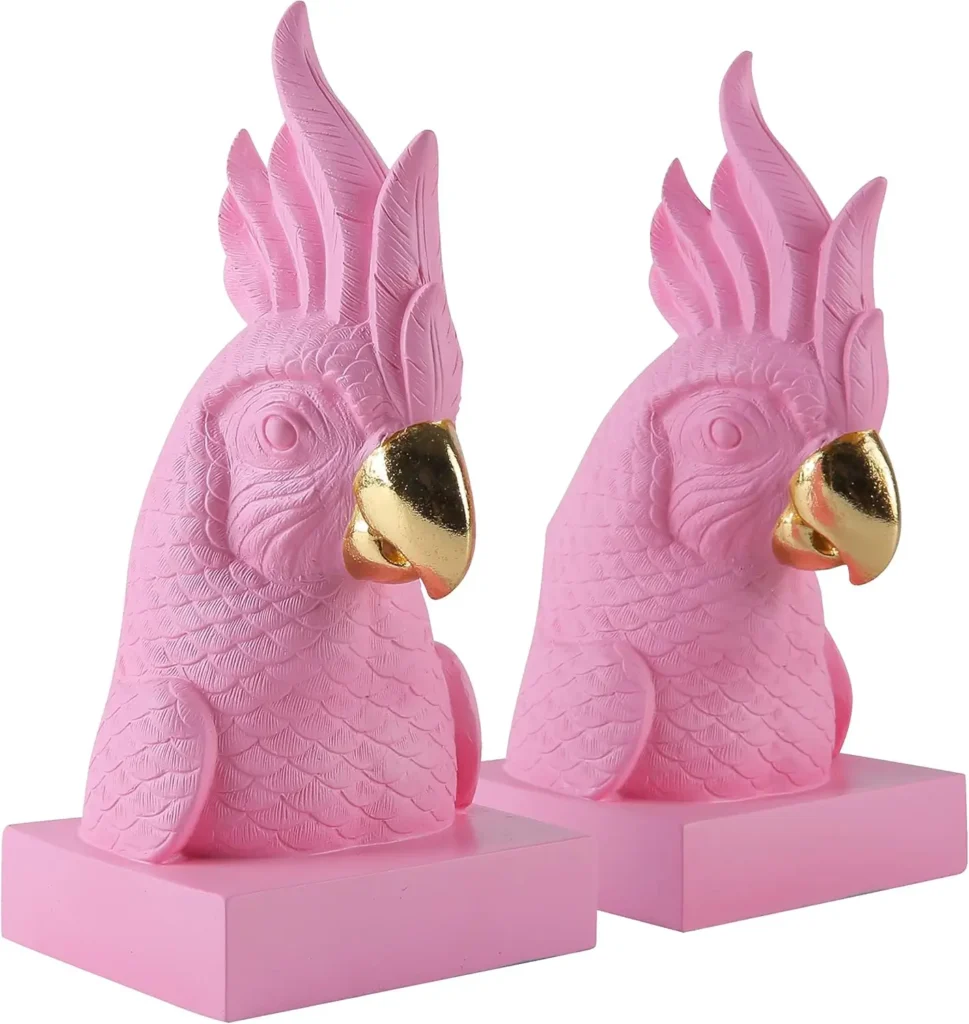 The popping pink parrot bookends with a gold beak are bold in the best way. They are heavy, well made, and feel like functional art.