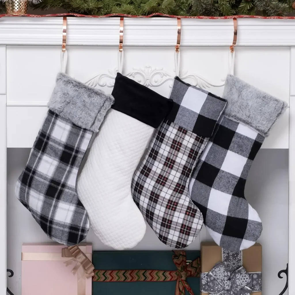 If you like modern farmhouse décor, the black and white plaid stocking is a must. It’s bold but still cozy, giving your mantel a bit of contrast. This one looks especially nice in rooms with black metal frames, white walls, or wood accents.