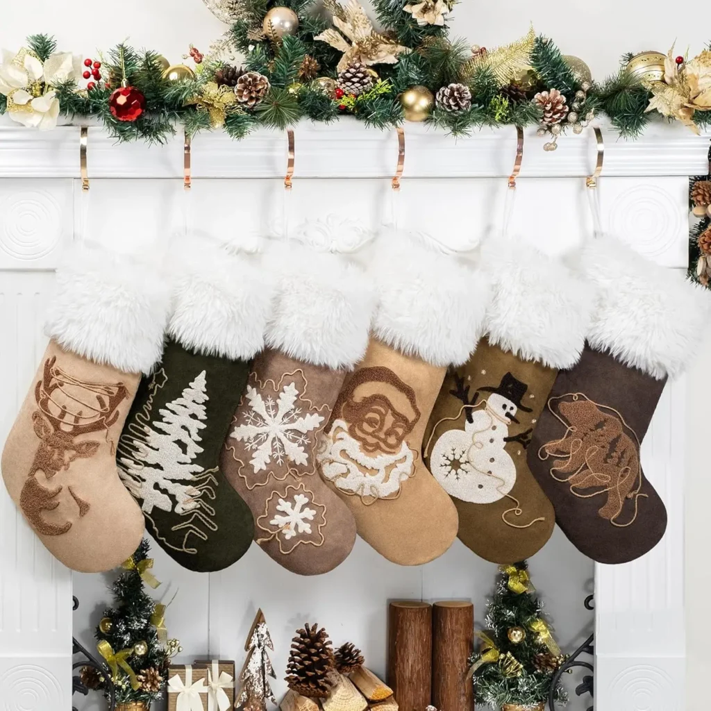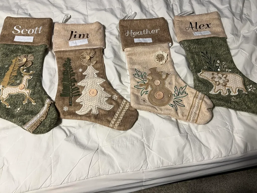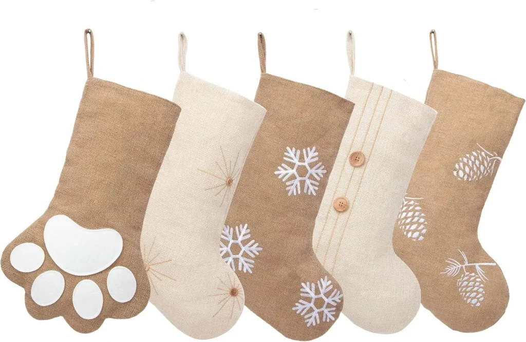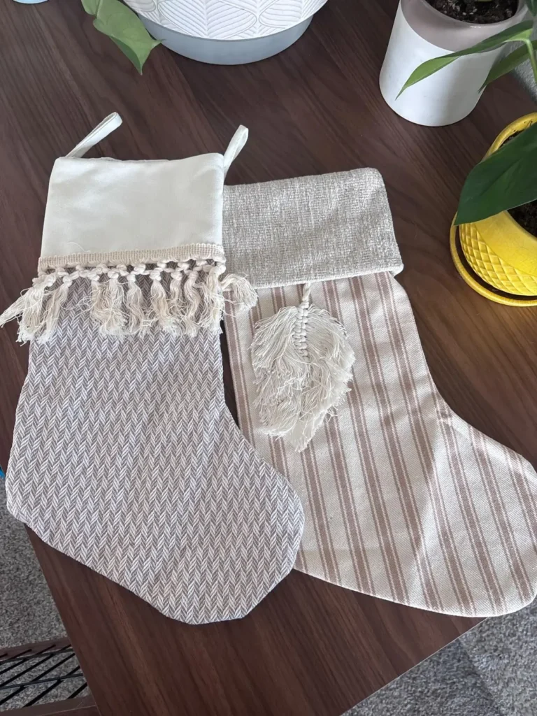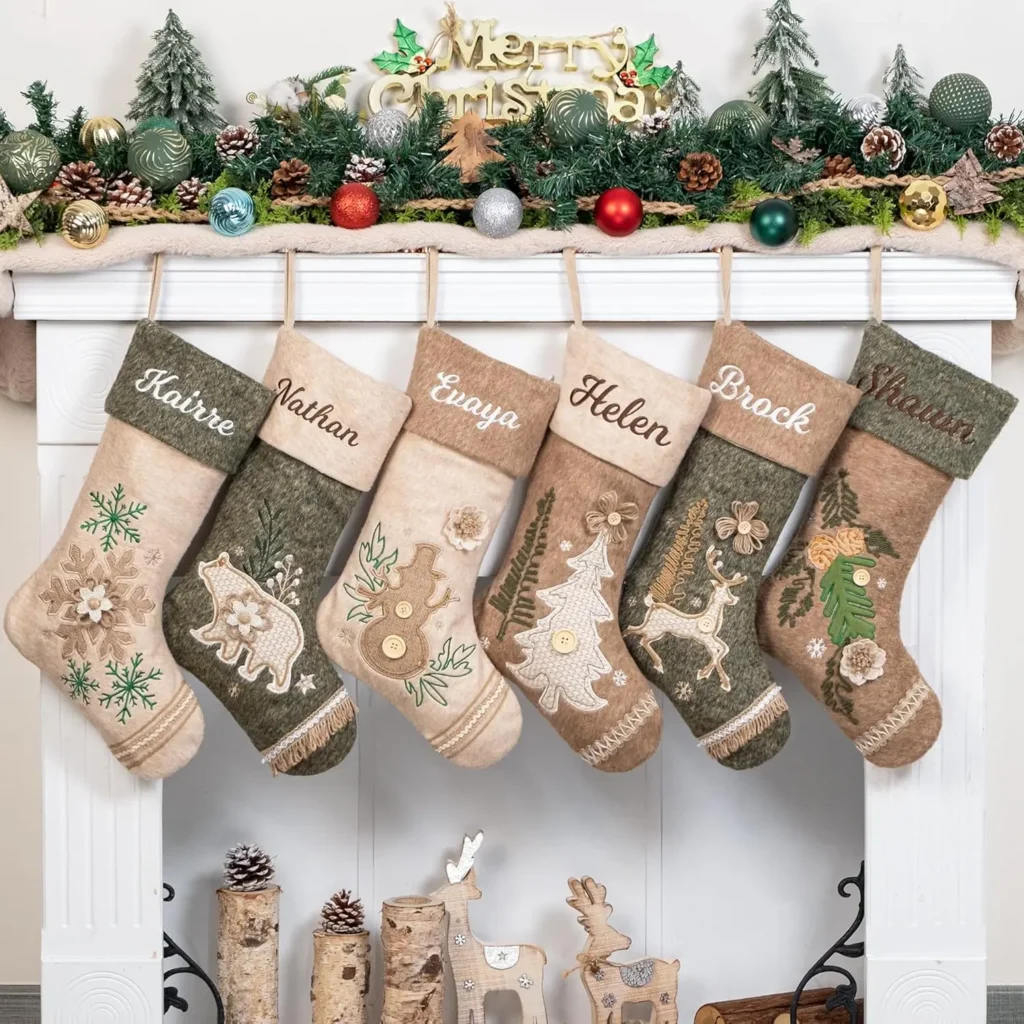 If your décor is clean and timeless, these embroidered linen stockings are perfect. They’re simple, soft, and look beautiful with any color scheme. The linen and burlap textures bring a rustic warmth that feels classic but not heavy.