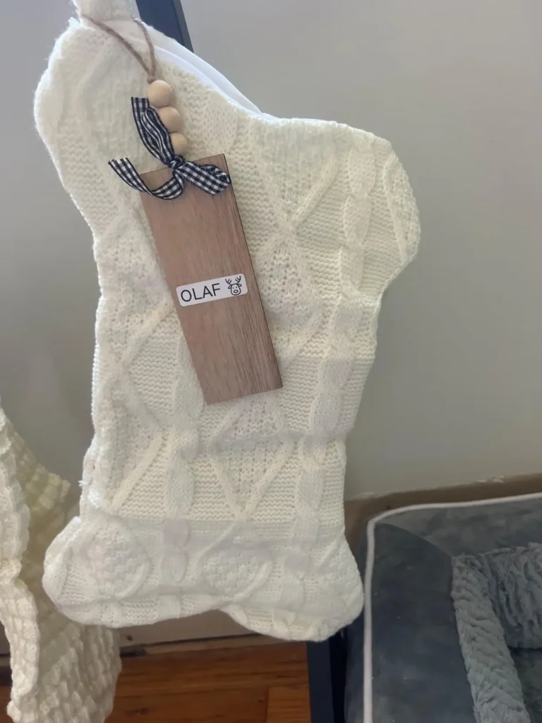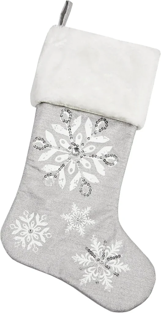 It pairs beautifully with clear ornaments, metallic candles, or white faux fur pillows nearby. If you’re going for that “winter wonderland” look, this stocking ties everything together beautifully.