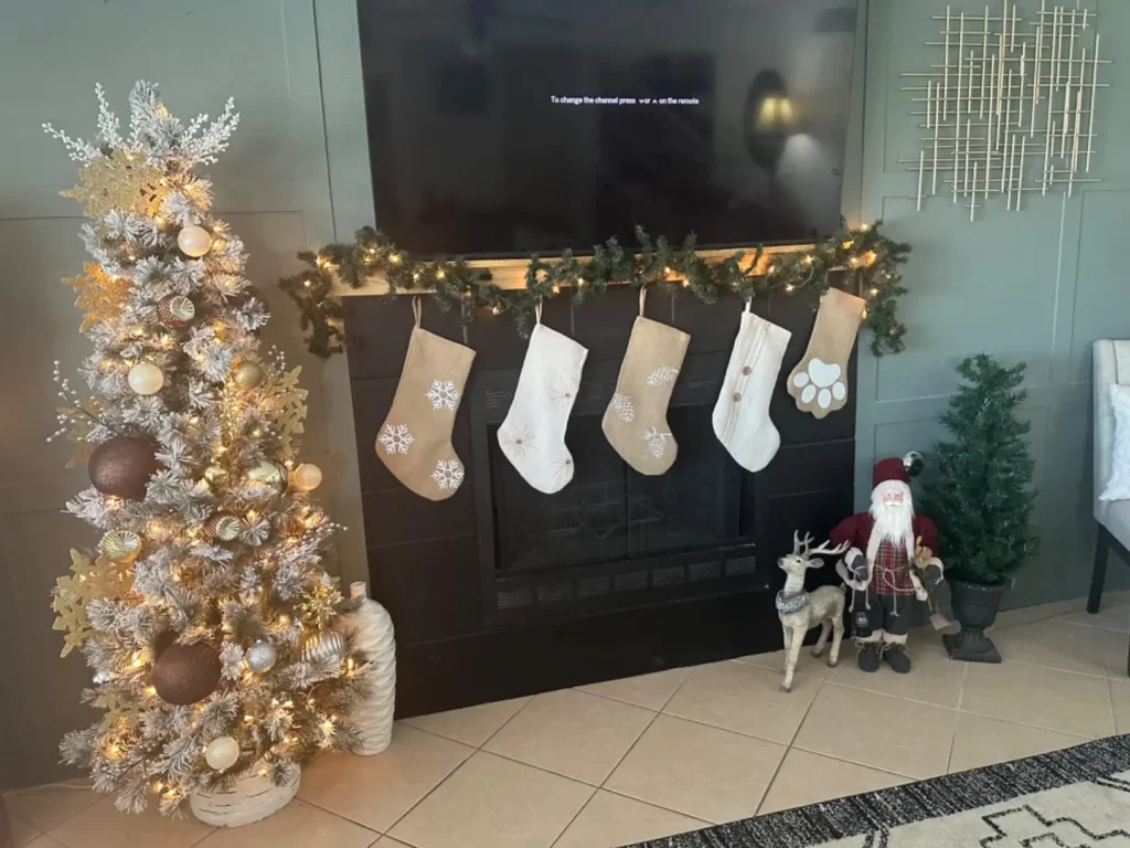 I’d style it with a simple garland and black candlesticks for balance. You can even mix in a few solid white stockings for variety while keeping everything cohesive.