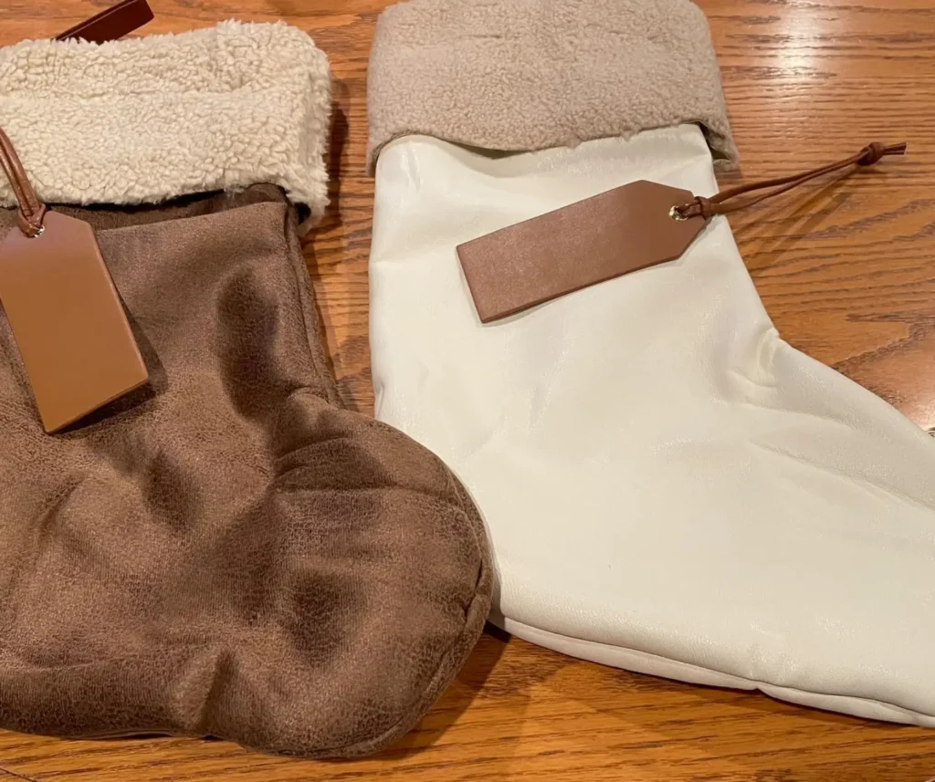 This faux leather stocking feels modern and elevated. The smooth texture and neutral color make it easy to style with both rustic and contemporary décor. It’s a nice contrast against soft fabrics like knits or velvets.