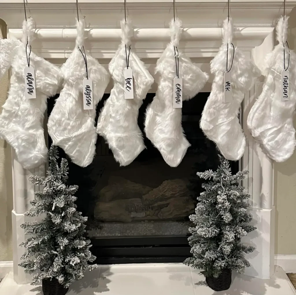 This white faux fur stocking is pure winter magic. It reflects your Christmas lights and instantly adds a soft glow to the room. It’s simple but has that touch of luxury that feels elegant.