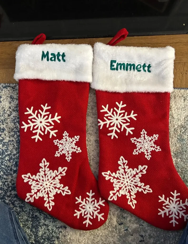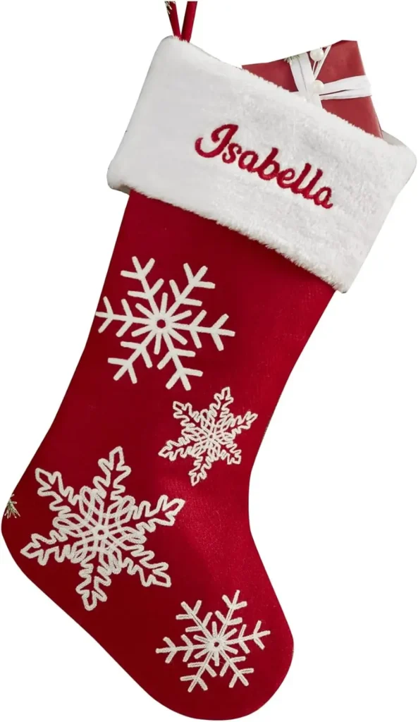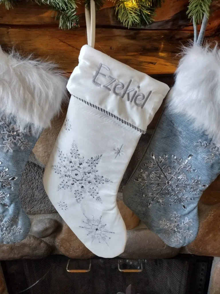 This silver snowflake stocking brings just the right amount of sparkle. The rhinestones and embroidered snowflakes shine softly under your Christmas lights without feeling flashy.