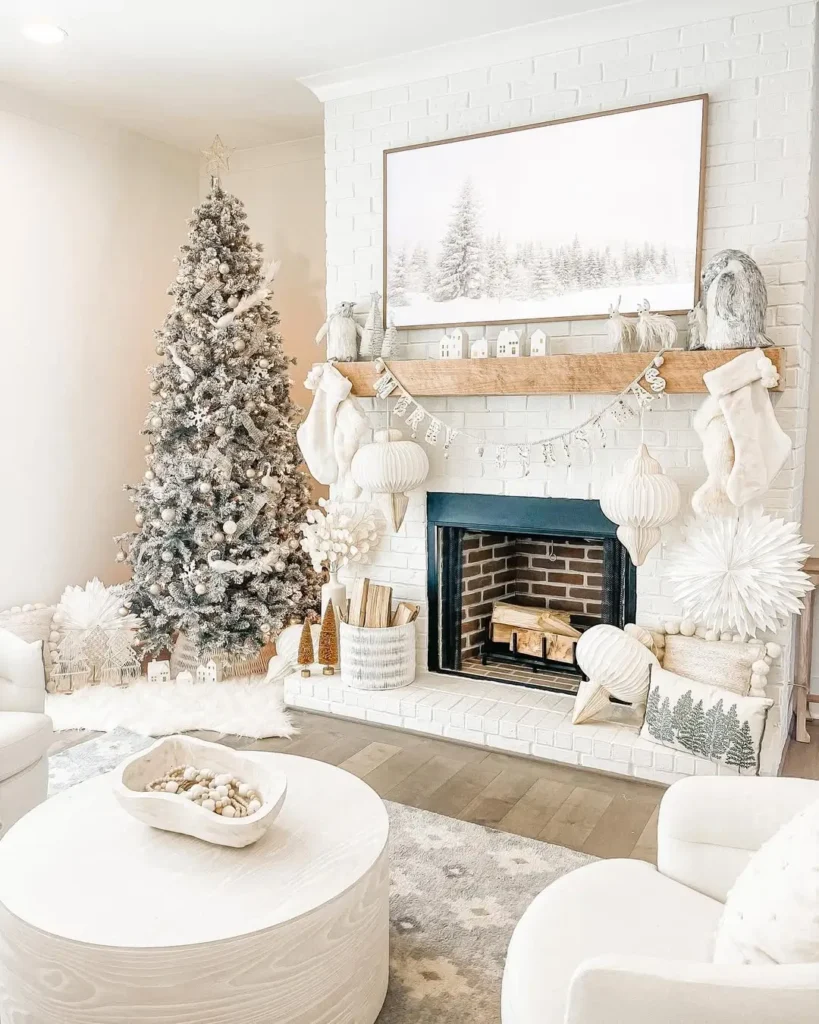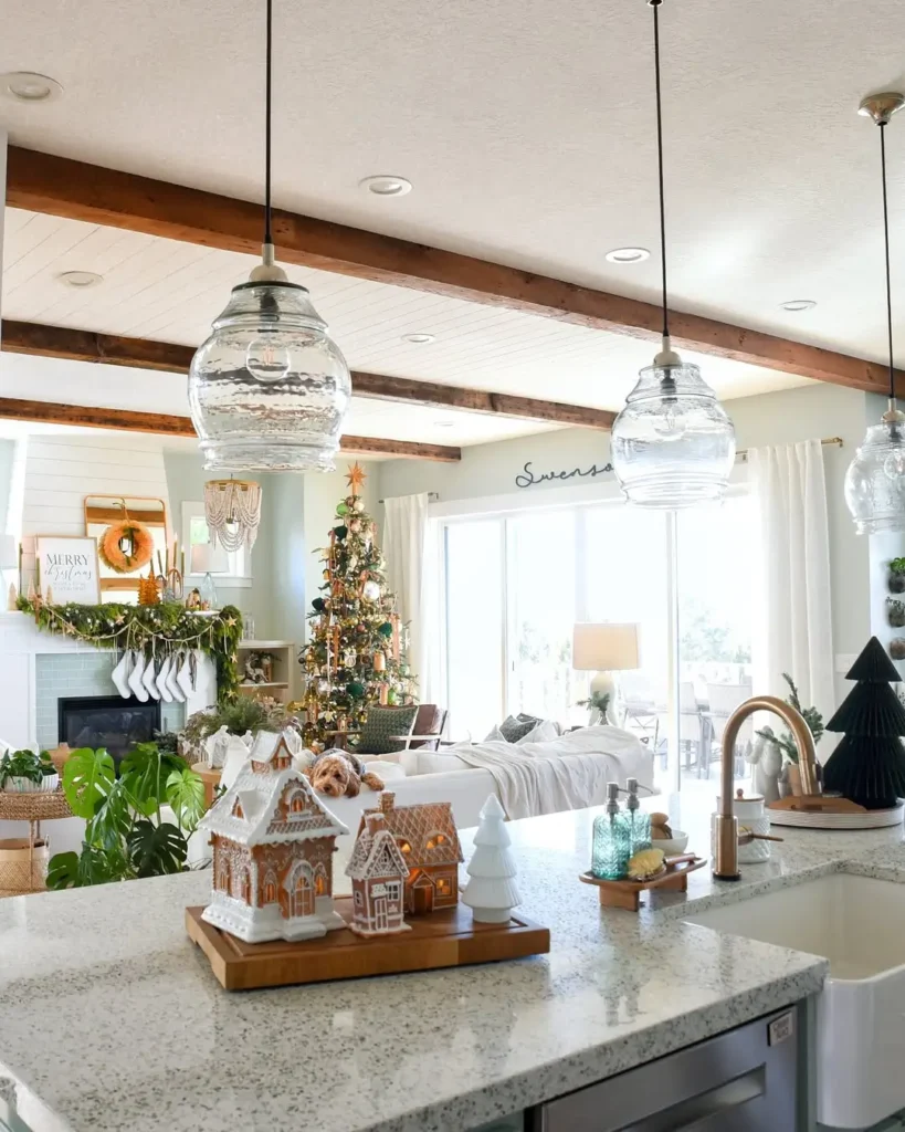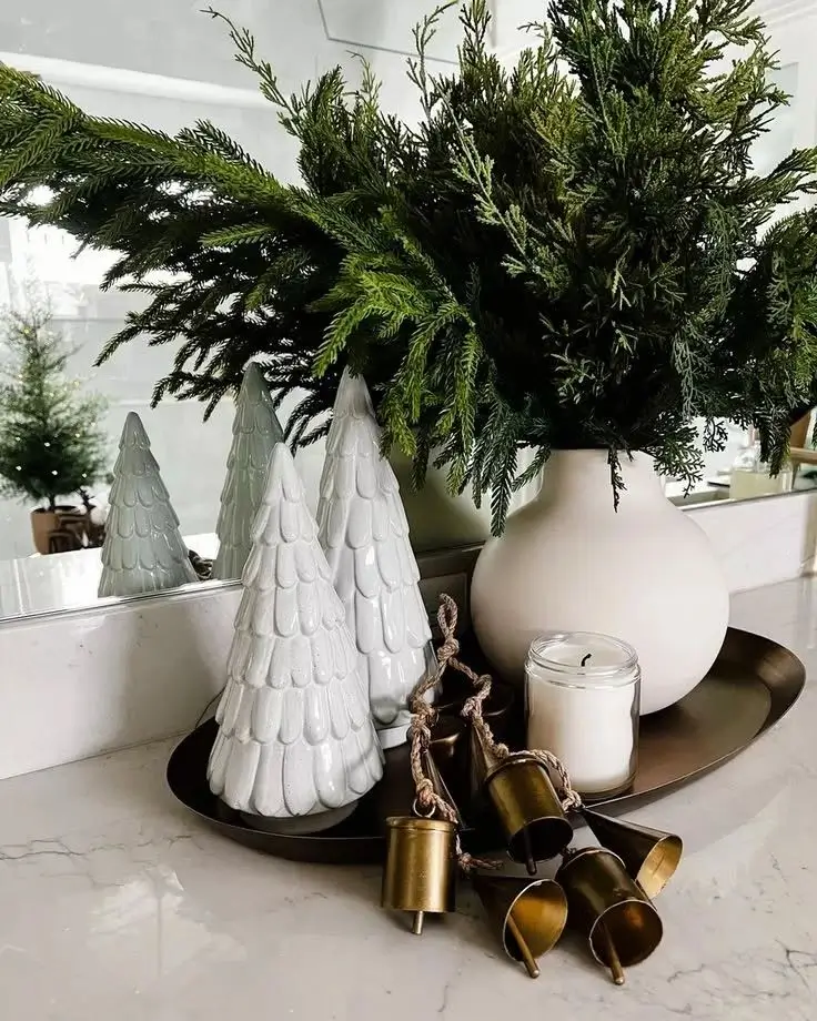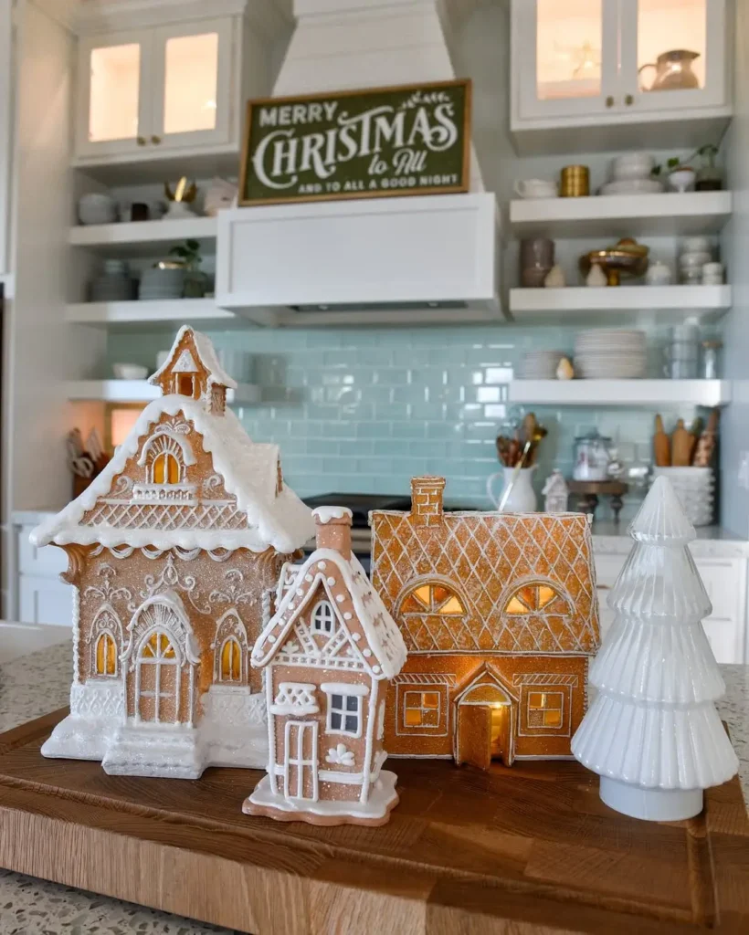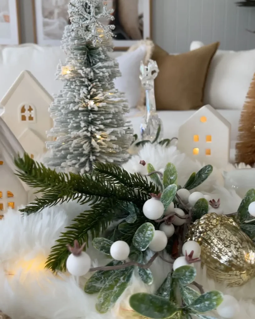 Use ceramic or porcelain gingerbread houses paired with white tabletop trees. I would definitely sprinkle in some faux snow because it adds that soft winter magic without overwhelming the color palette. This centerpiece feels playful and cozy, especially for family spaces.
