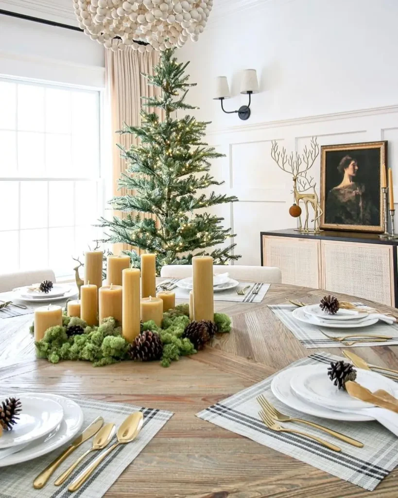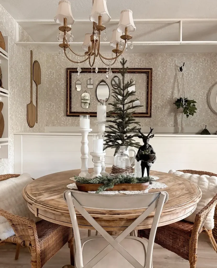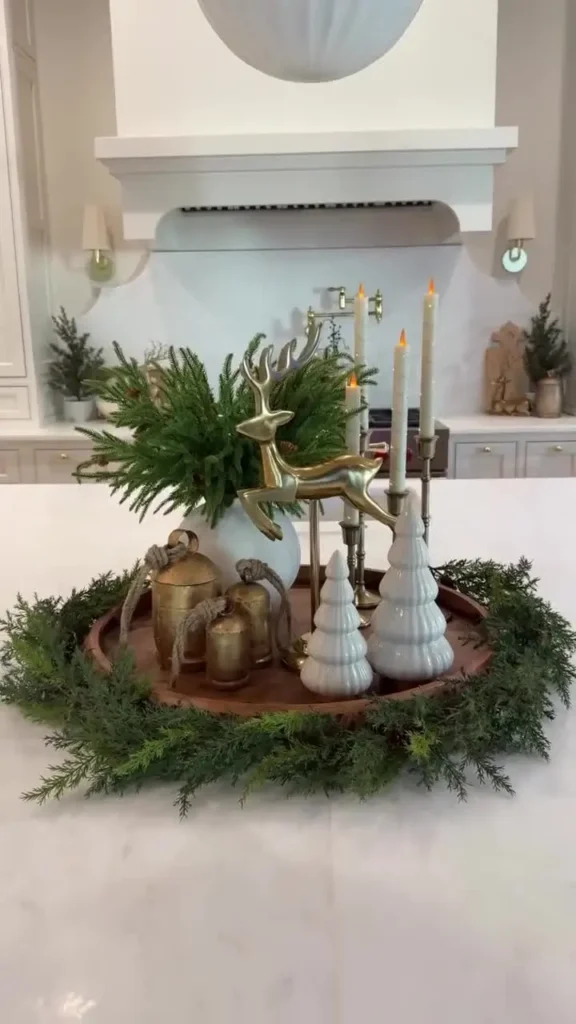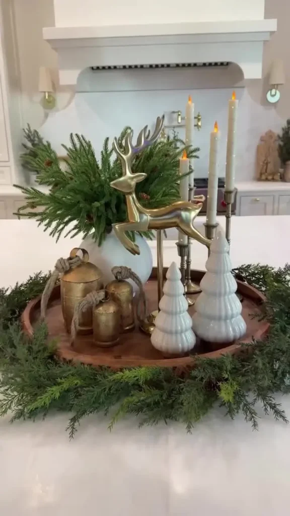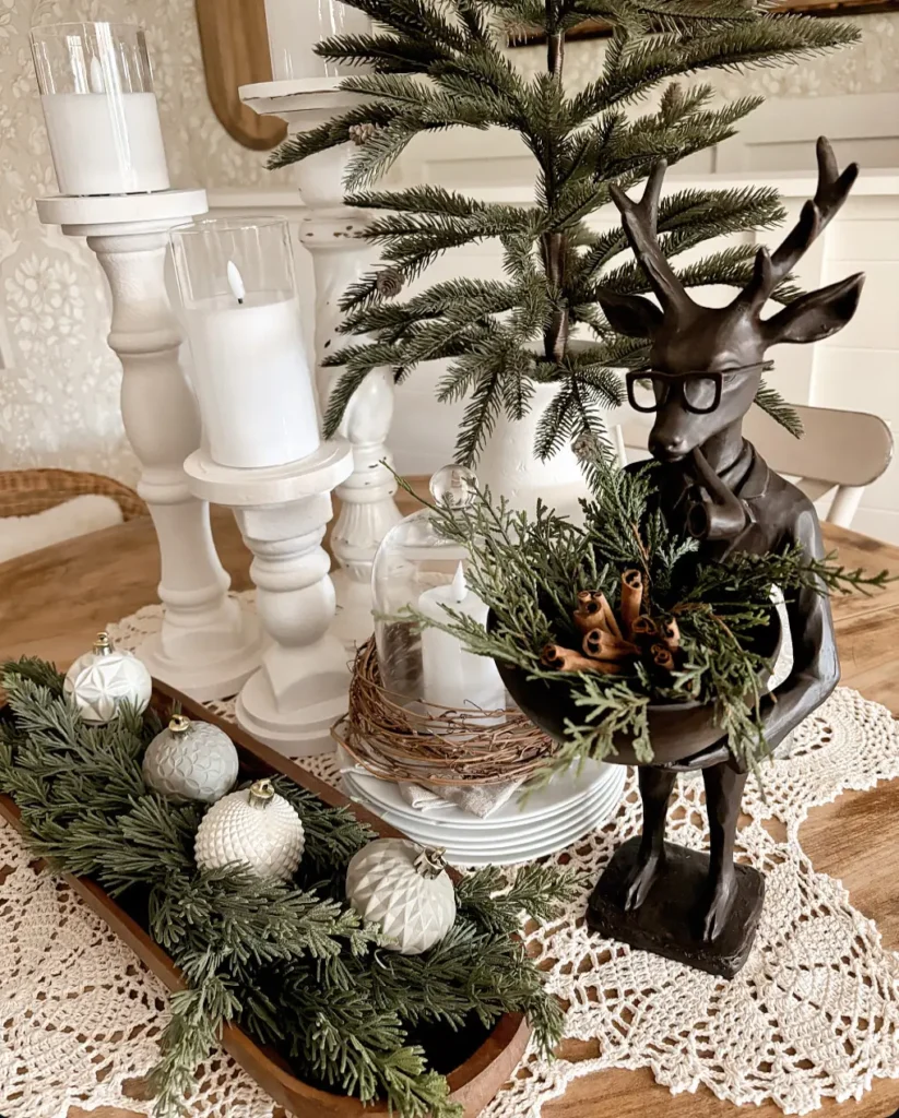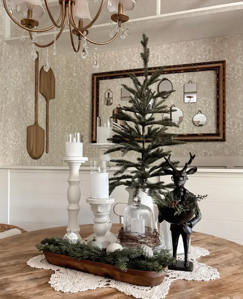 If you have a cute little reindeer figurine or a glass cloche candle display, this is the place to show them off. The mix of textures creates a warm, moody glow that feels perfect for evening dinners or cozy winter movie nights.