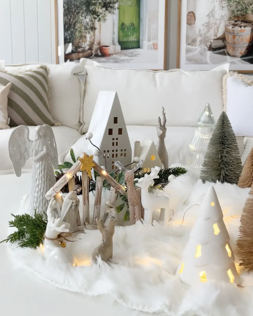 I am obsessed with this coffee table setup. Start with a white furry mat to mimic snow. Then add a cute nativity scene, white Christmas village houses, angels, reindeer, and tabletop trees.