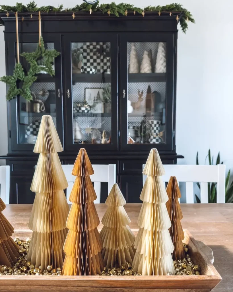 Paper Christmas trees are underrated. They are lightweight, affordable, neutral, textured, and honestly adorable. Grab a tray or a dough bowl, pop in a few paper trees, and suddenly you have one of the easiest neutral centerpieces ever.