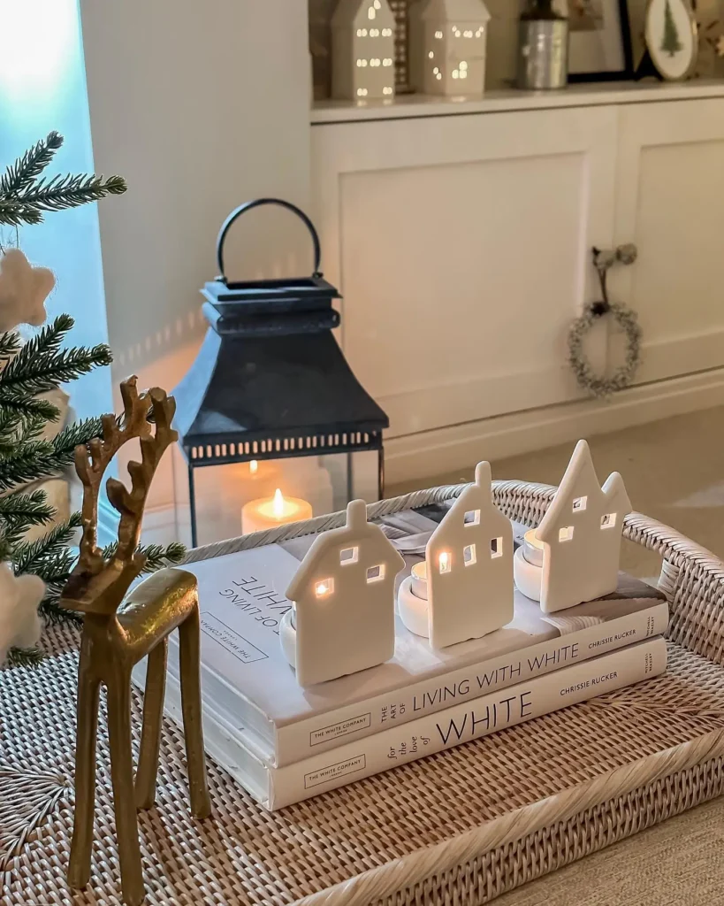 For my minimal girlies, this one is a soft, calming beauty. Grab a woven tray and stack a couple of white books as your base. Add cute Christmas village themed candle holders, a small bronze reindeer, and a touch of greenery.