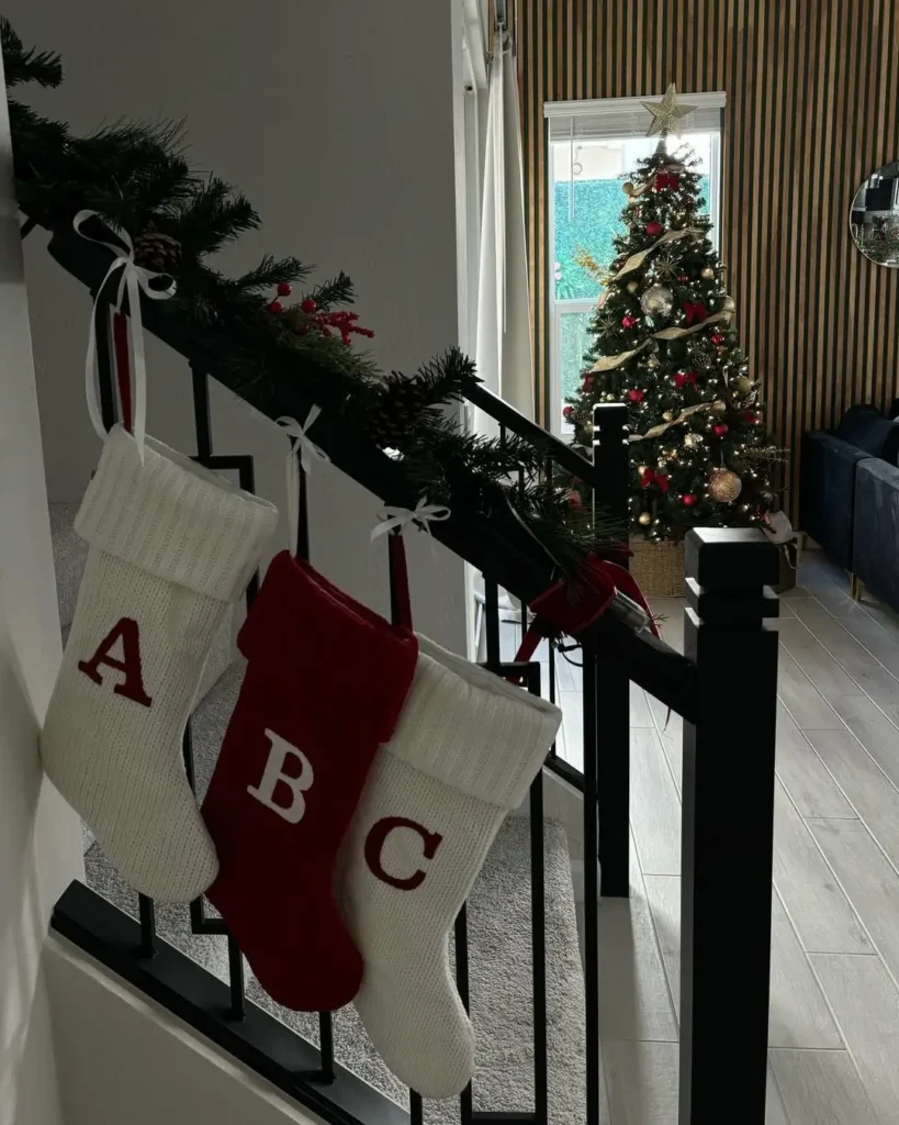 It’s a simple way to make your staircase the centerpiece of your home. Plus, it’s one of those décor ideas that looks amazing in photos. Imagine your stockings glowing softly under warm Christmas lights. Total holiday magic.