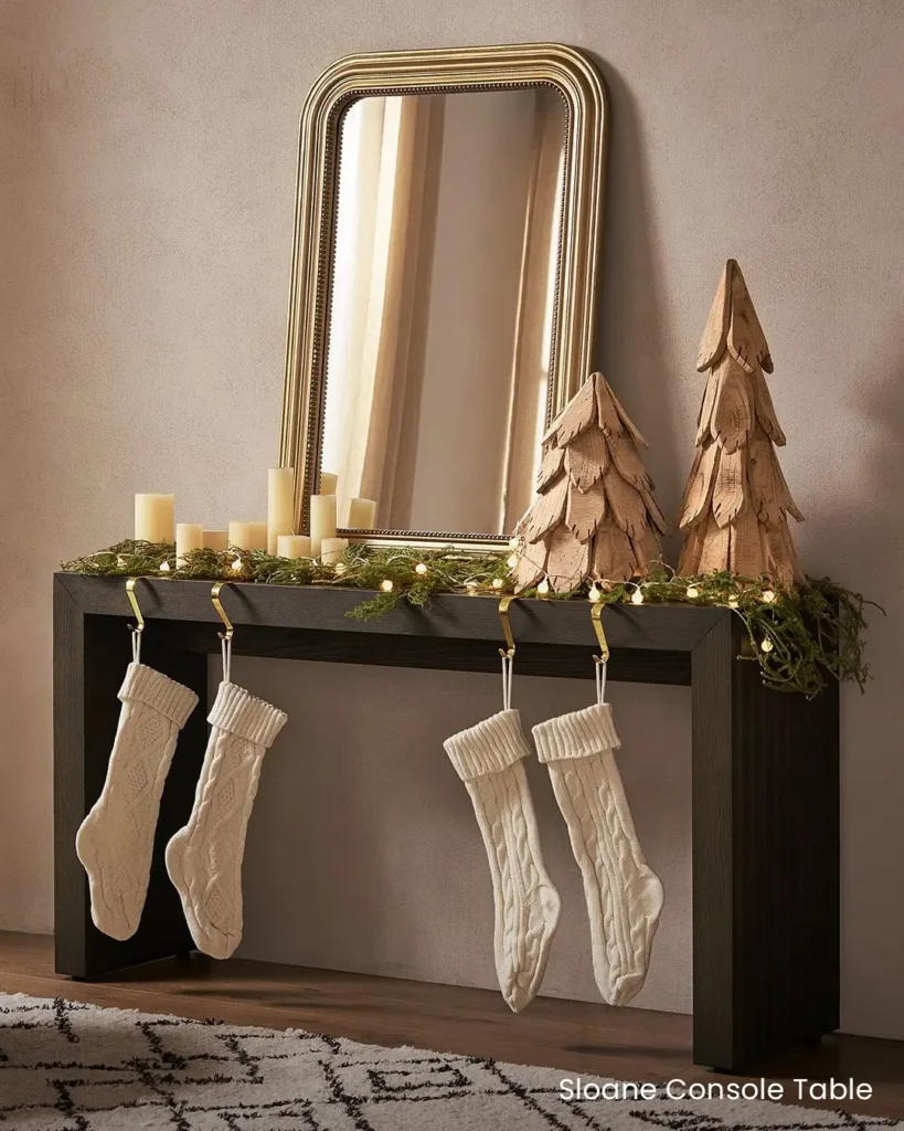 No mantle? No problem. Your console or entryway table can totally double as one. Line up a few cute decorations, maybe a mini Christmas tree, a candle, and some greenery. Then use stocking holders or clear command hooks to hang your Christmas stockings along the edge.