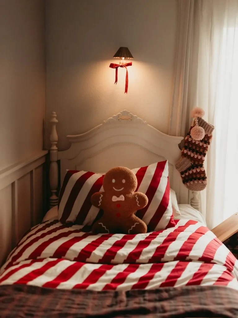 It adds a sweet, cozy vibe to your bedroom and makes waking up on Christmas morning feel extra special. If you want to take it up a notch, add a soft garland or a strand of fairy lights around the bed frame. It’s low effort but high charm.