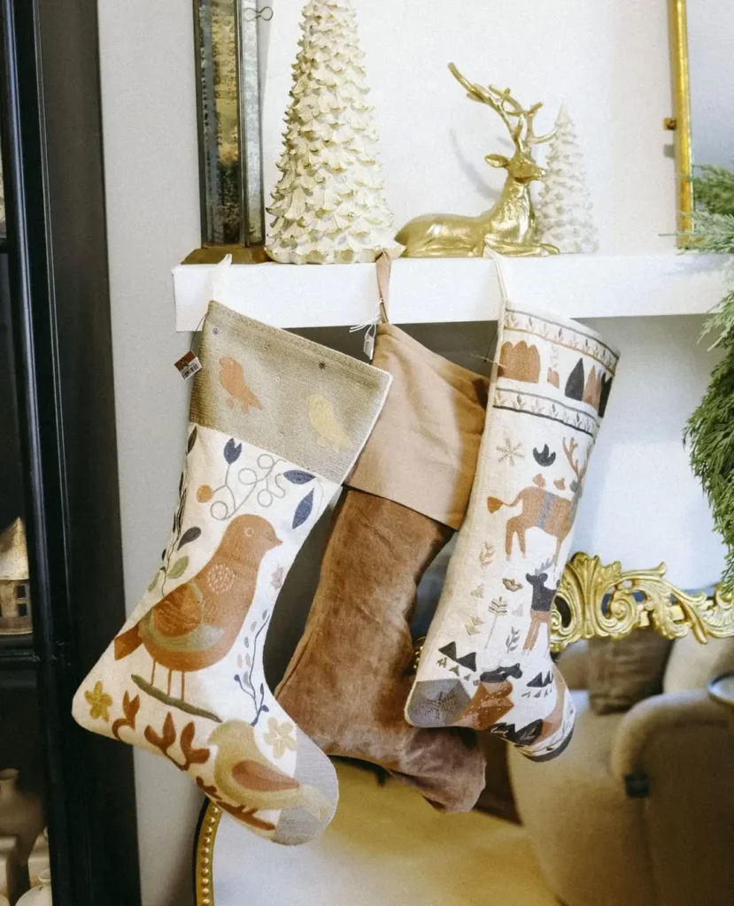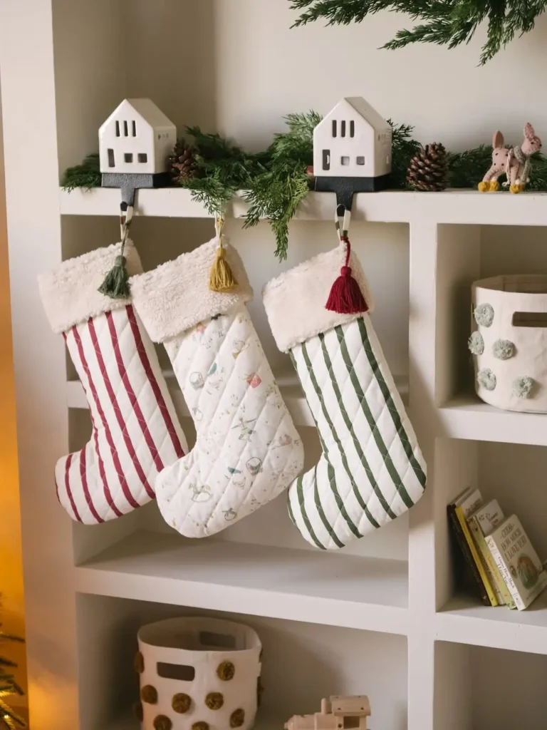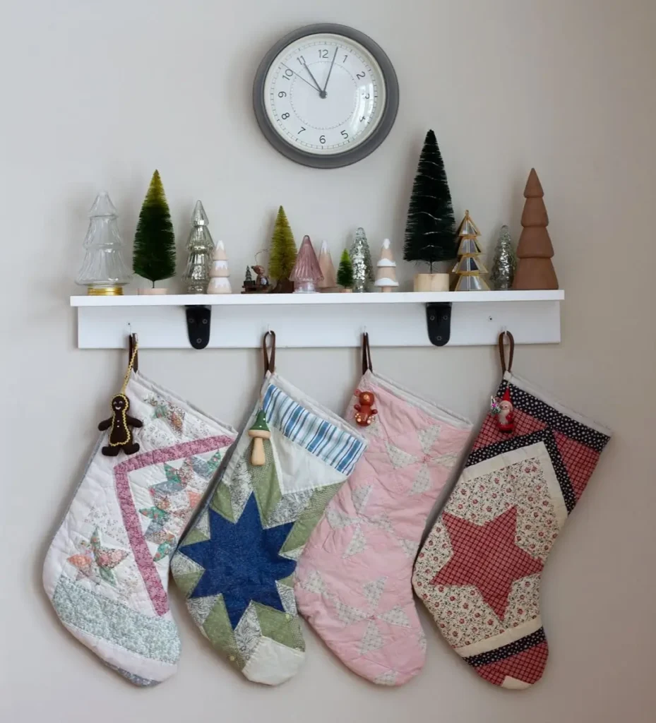 Got floating shelves? Perfect. Attach a few small hooks underneath and hang your stockings from there. It’s functional, simple, and totally chic.