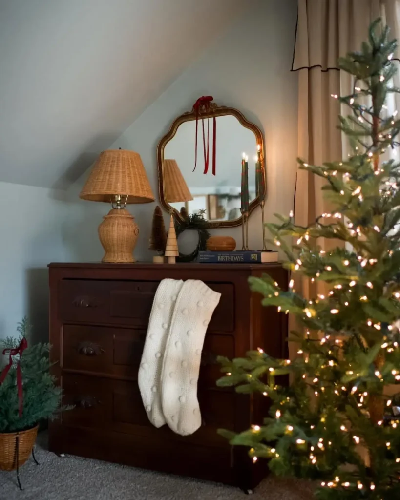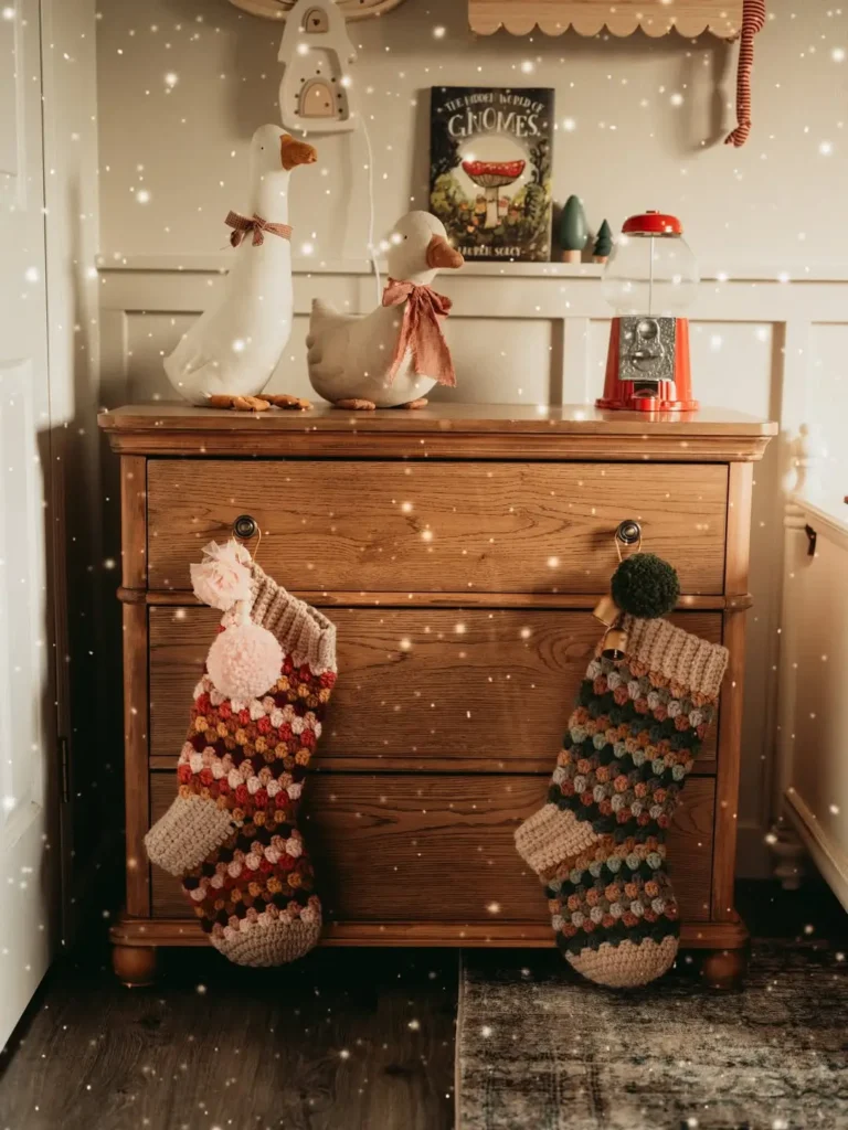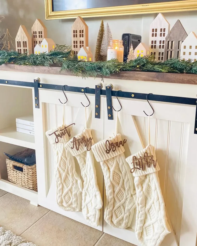 If your living room is more “cozy cube” than “open concept,” hanging your Christmas stockings on a dresser or TV stand is a total win. Line them up neatly using small command hooks or clips along the edge.