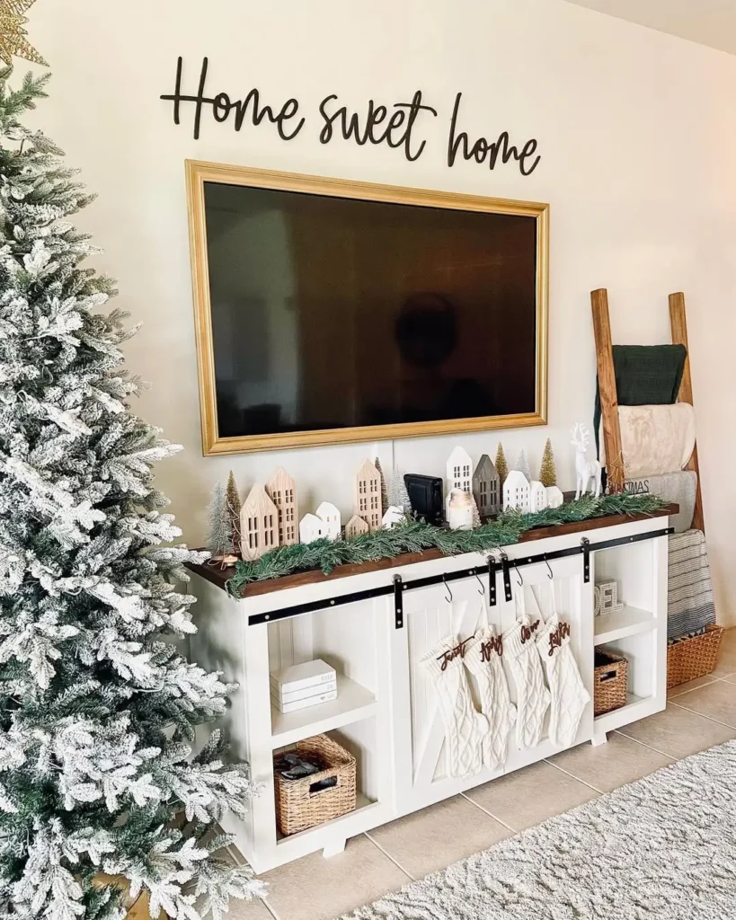 Decorate the top of the shelf with greenery, candles, or your favorite Christmas figurines. If your shelf is over the TV or a dresser, even better. It’ll instantly look intentional and styled, like a mini holiday setup you actually planned, even if you just threw it together five minutes before guests arrived.