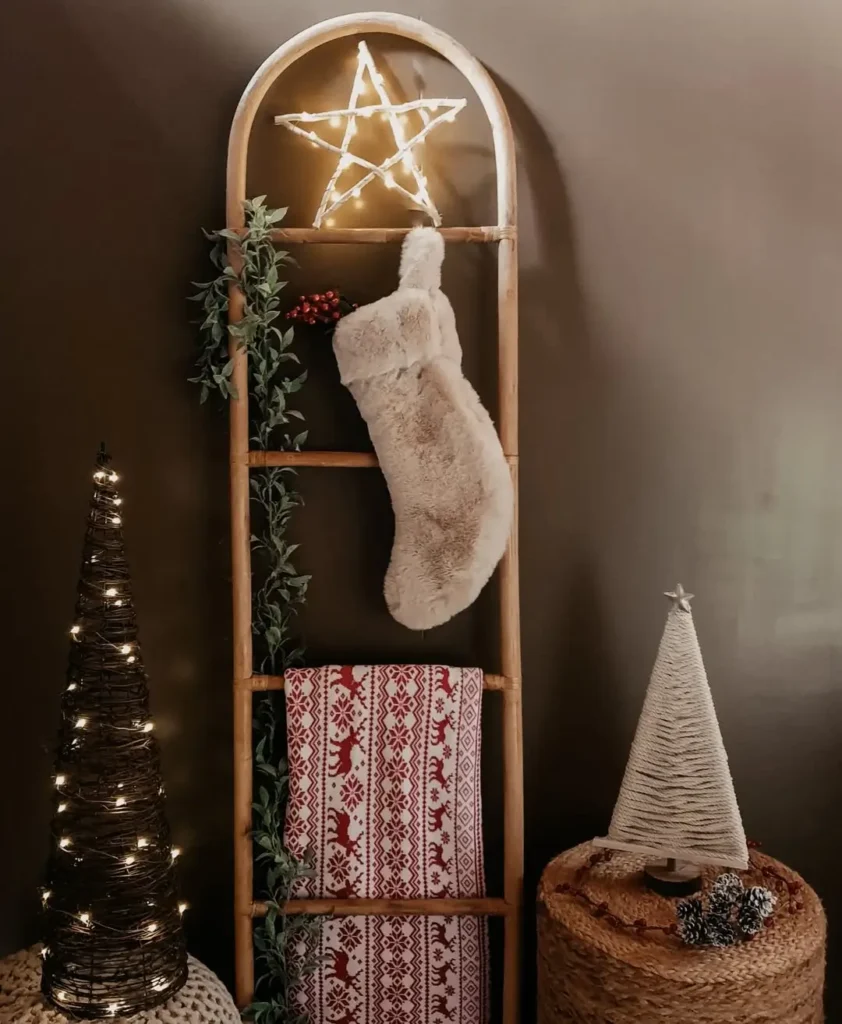 You can wrap fairy lights or garland around the ladder for an extra festive touch. Bonus tip: use the lower rungs for cozy blankets or a string of pinecones to really layer the look. It’s space-saving, functional, and Pinterest-level pretty.