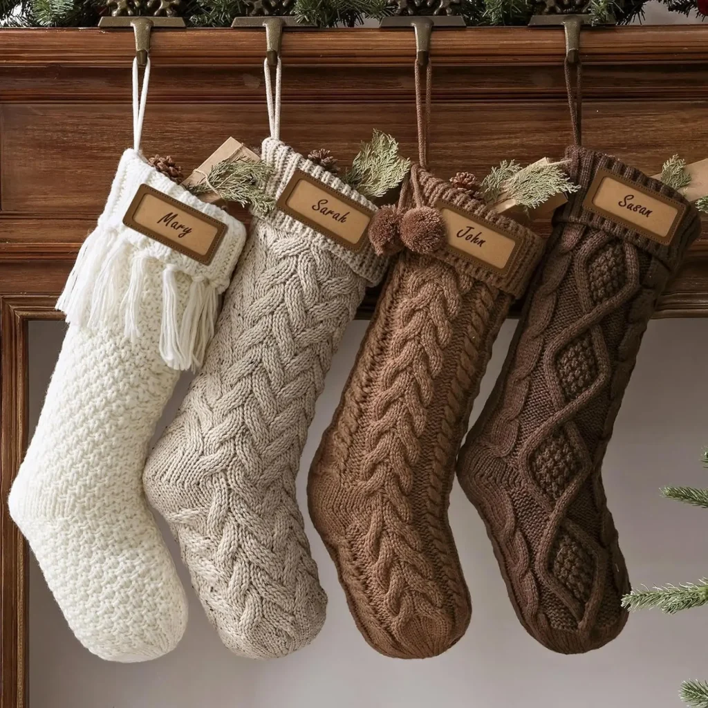 - Earthy tone Cable Knit Stockings Great if you’re into the farmhouse or natural look.
