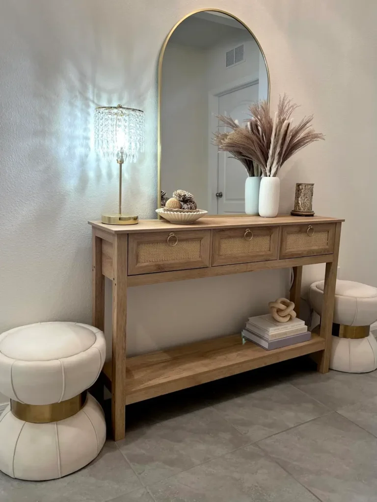 This entry table combines natural rattan texture with light oak tones for a breezy, boho vibe.