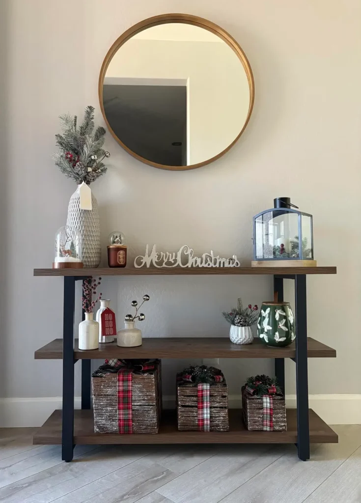The rustic wood and black metal combo keeps it modern and timeless. Rotate decor seasonally to keep this one feeling fresh.